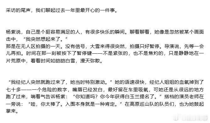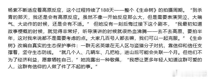 杨紫高原反应持续了188天杨紫在片场得知获白玉兰提名 、《GLASS 中文版》开年刊封面采访太戳心!拍摄《生命树》的 188 天里,她一直在默默对抗高原反应,在恶劣环境中坚持创作的毅力超让人敬佩✨ 更让人动容的是,去年得知获白玉兰提名时,她正在片场忙碌,搭档演员老师和高原巡山队队员们都为她真心喝彩,这份在艰苦片场收获的温暖与认可,太珍贵了~