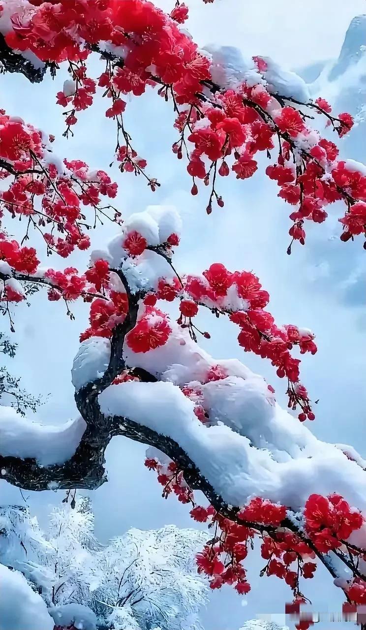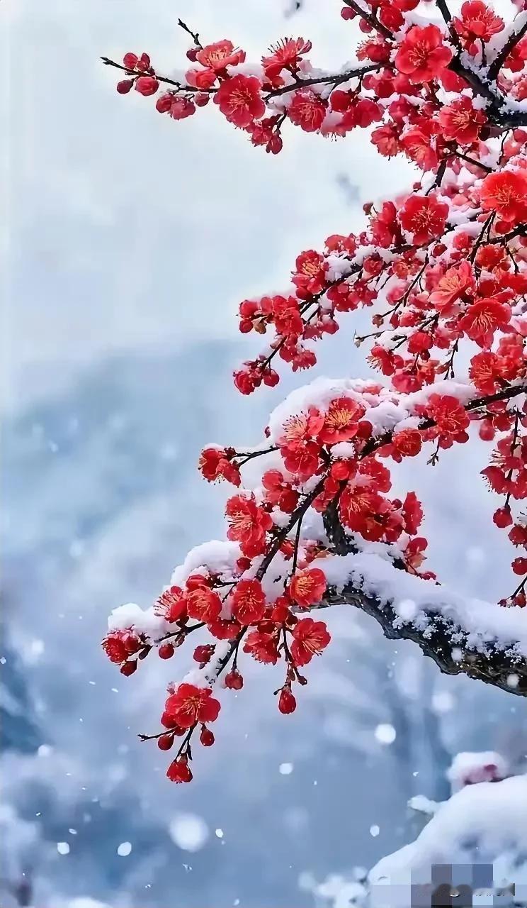 雪花落满枝头,梅花依旧红艳。
