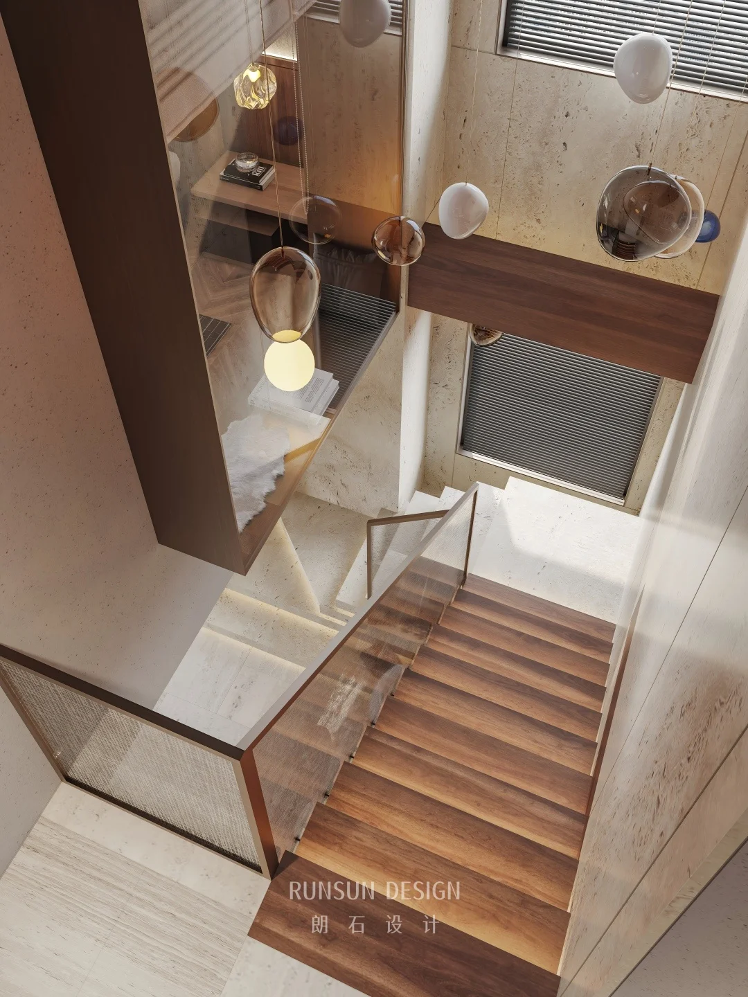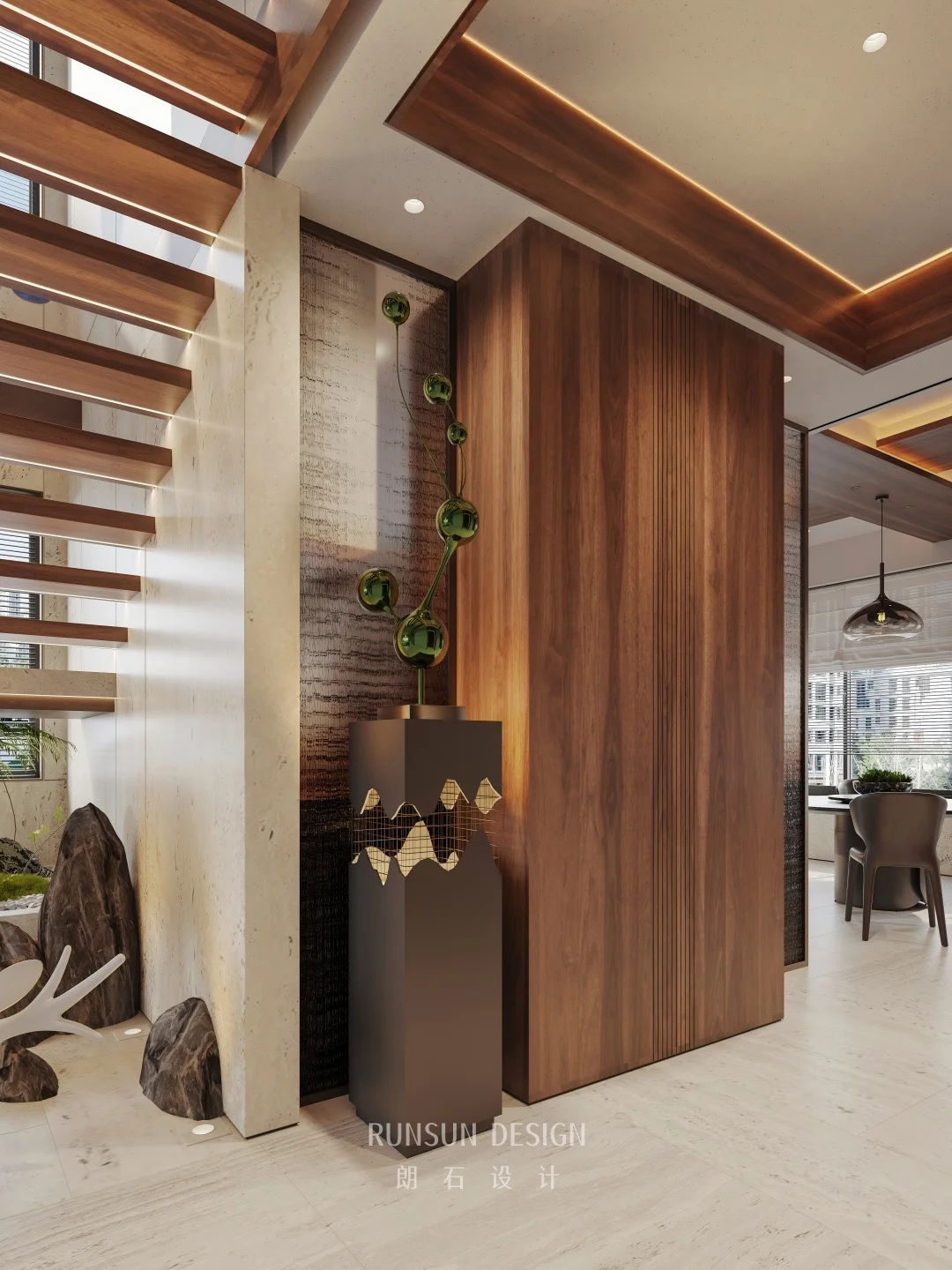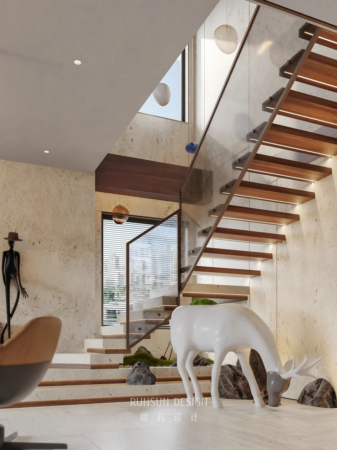 以挑空楼梯为核心,采用悬浮式踏步 + 玻璃护栏,搭配踏步内嵌灯带,既增强通透感,又提升高级感; 墙面选用带有自然纹理的石材 / 岩板,结合木质元素,平衡冷硬与温润质感。 装饰细节: 融入新中式元素(如小鹿雕塑、山石苔藓造景),弱化现代风的冰冷感; 软装以简约造型家具 + 艺术装置(人形摆件、球形吊灯)为主,强化空间的艺术氛围。