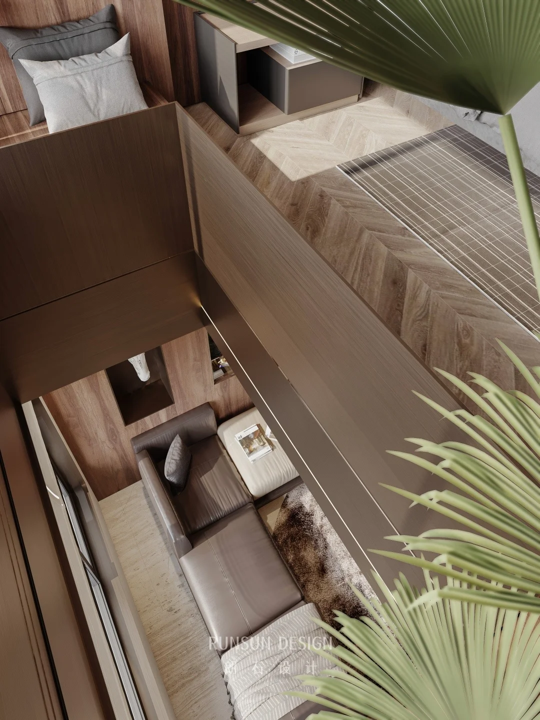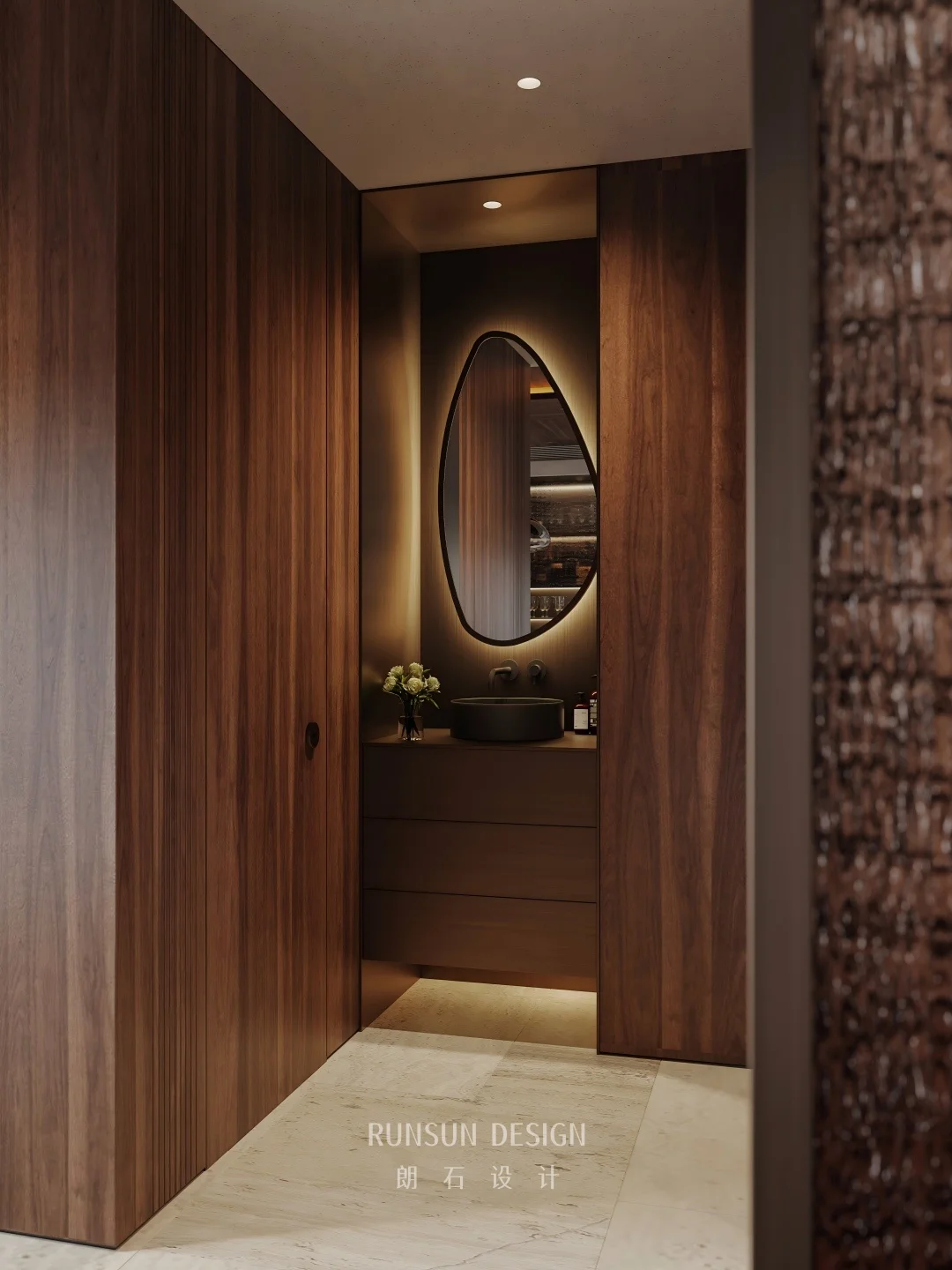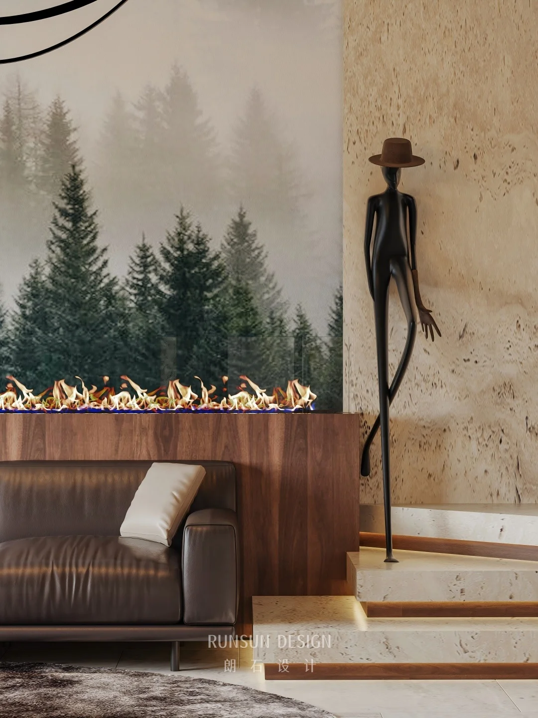 以挑空楼梯为核心,采用悬浮式踏步 + 玻璃护栏,搭配踏步内嵌灯带,既增强通透感,又提升高级感; 墙面选用带有自然纹理的石材 / 岩板,结合木质元素,平衡冷硬与温润质感。 装饰细节: 融入新中式元素(如小鹿雕塑、山石苔藓造景),弱化现代风的冰冷感; 软装以简约造型家具 + 艺术装置(人形摆件、球形吊灯)为主,强化空间的艺术氛围。