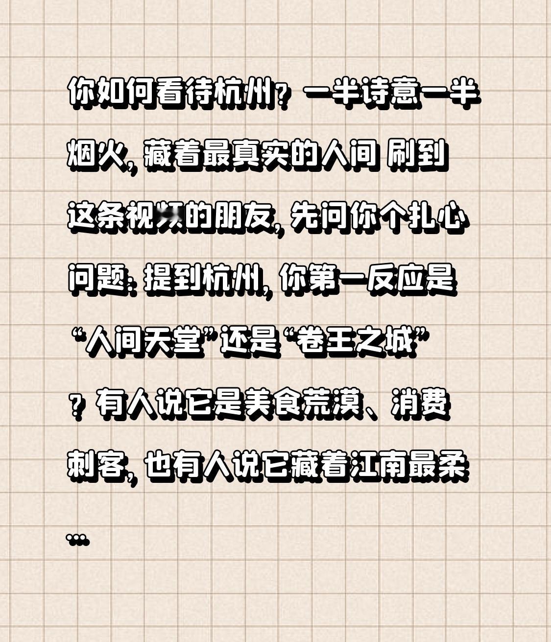 你如何看待杭州?一半诗意一半烟火,藏着最真实的人间 刷到这条视频的朋友,先问你个扎心问题:提到杭州,你第一反应是“人间天堂”还是“卷王之城”?有人说它是美食荒漠、消费刺客,也有人说它藏着江南最柔的诗意——今天咱们不吹不黑,聊聊杭州最真实的模样! 来杭州之前,我和很多人一样,以为这里只有西湖、断桥和密密麻麻的互联网公司。直到在这儿住了半年才发现,杭州的真相,藏在“矛盾”里。 早高峰的钱江新城,西装革履的年轻人捧着咖啡狂奔,地铁里讨论的全是项目进度,这里的节奏快到让人喘不过气,“996”“内卷”是绕不开的标签。房价高、消费贵不是传说,一碗普通面能卖到30块,合租单间月租轻松过四千,难怪有人说“杭州赚钱杭州花,一分别想带回家”。互联网的造富神话确实存在,但更多普通人在为生活奔波,这是杭州最现实的一面。 可当你拐进老城区的小巷,会发现另一个完全不同的杭州。清晨六点的大马弄菜场,卖临安春笋的大姐一边剥壳一边唠家常,顺手给熟客塞一把免费小葱;馒头山社区的阿婆从井里打水洗衣,踩着三轮车的师傅吆喝声穿过白墙黑瓦,邻里间用温软的杭州话打招呼,时光仿佛慢了下来。 最惊喜的反转,是杭州把“老”与“新”揉得恰到好处。河坊街的青石板路上,老字号的葱包桧滋滋作响,隔壁就是年轻人扎堆的文创小店;桥西历史文化街区里,老人们在运河边下围棋,不远处的非遗馆里,“百工灵”IP用游戏动画让藤编、杭绣等老手艺火遍全网。你可以在西湖边喝着龙井看雷峰塔落日,也能在未来科技城感受数字经济的脉搏;既能吃到雪菜笋片鲜掉眉的片儿川,也能找到藏在写字楼里的宝藏日料。 有人吐槽它“卷”,但正是这份拼搏,让无数普通人有了逆袭的可能;有人抱怨消费高,却忘了这里的造富效应也曾成就过许多梦想。杭州就像一位懂生活的智者,既有“淡妆浓抹总相宜”的诗意,也有“人间烟火气最抚凡人心”的踏实;既推着你往前跑,也留着让你慢下来的角落。 其实一座城市最好的模样,就是不完美却真实。它有光鲜亮丽的一面,也有柴米油盐的琐碎;能让你为梦想奋斗,也能让你找到心灵的归宿。 你眼中的杭州是什么样子?是诗意江南,还是奋斗战场?评论区聊聊你的故事!