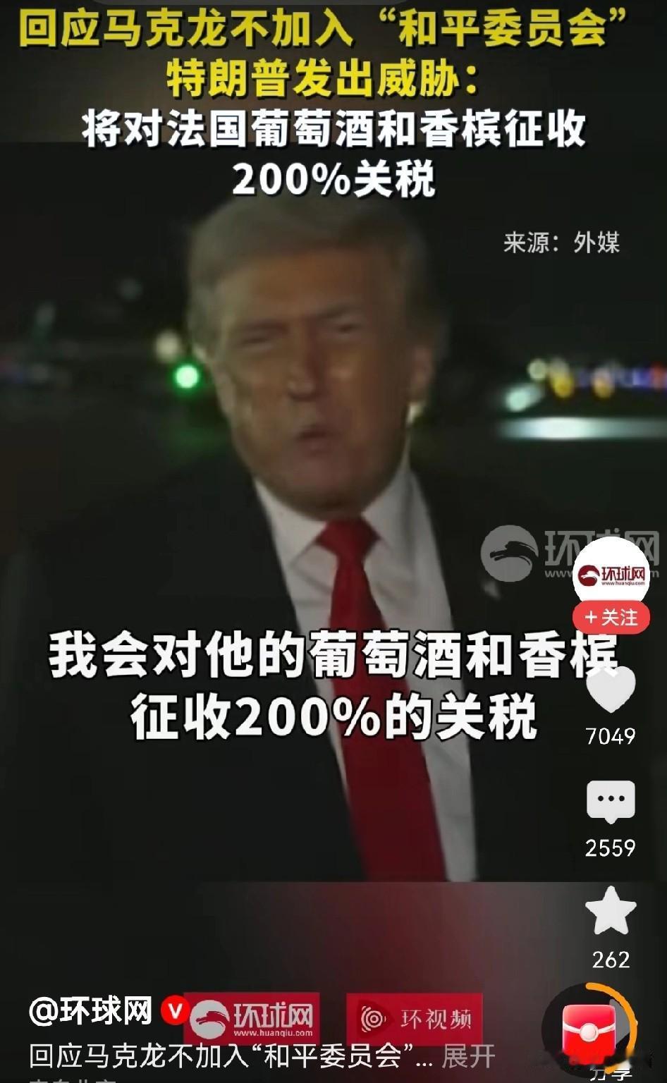 特朗普还是这么随心所欲, 当特朗普知道马克龙不加入自己组织的“和平委员会”时,特朗普表示“没人在意他,看来要对法国红酒和香槟加征200%的关税了,他会加入的。” 感觉特朗普真的变成了“关税之王”了,只要是任何一个国家不合他的心意就会对用关税大棒,而其他国家似乎也拿他没什么招,关税大棒一举,德国援助格林兰岛的15人军队立即撤了回来,看看马克龙能不能扛得住!