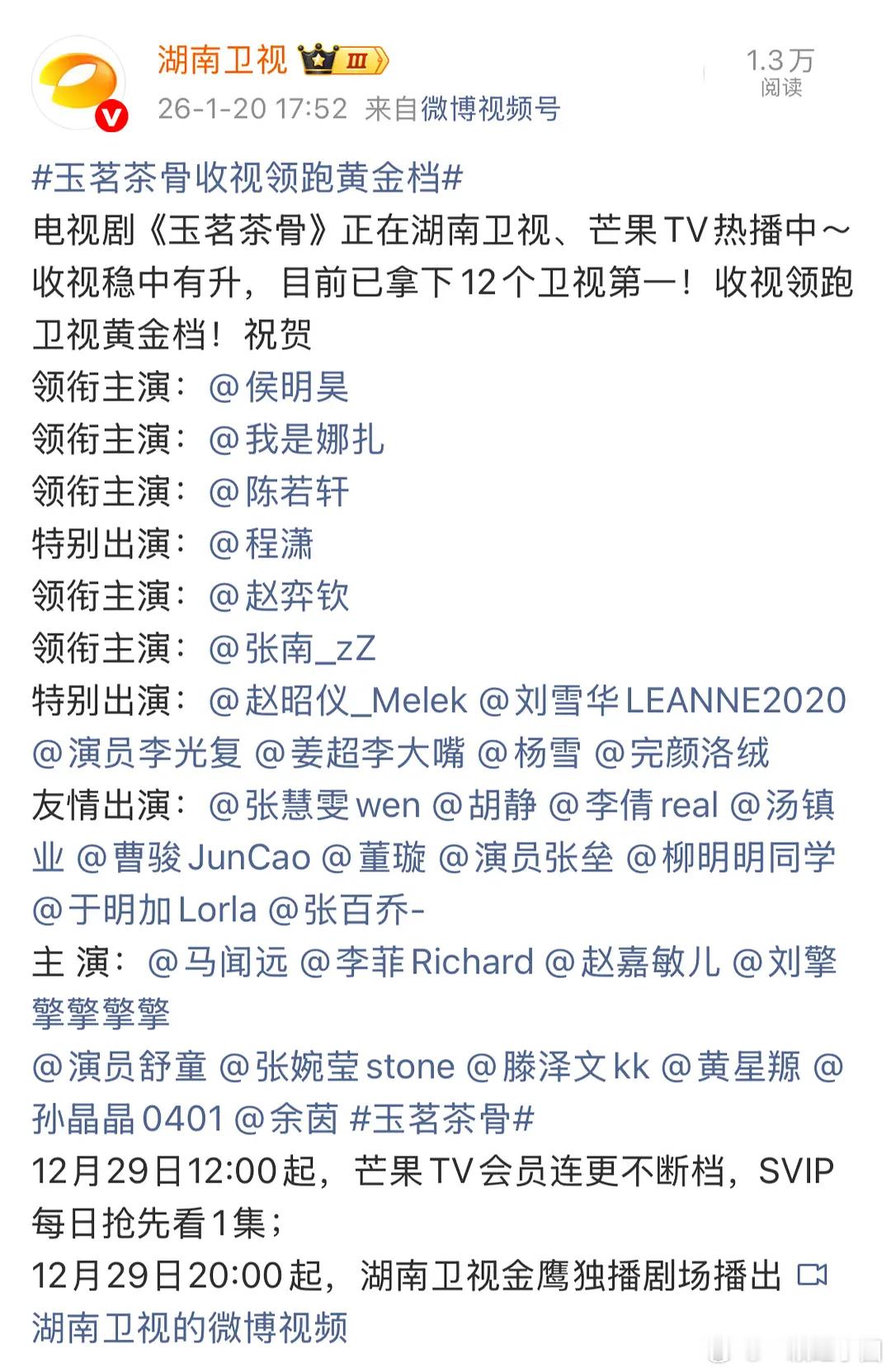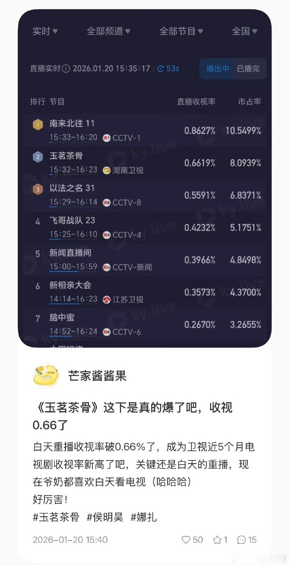 侯明昊 又收获了一番实绩!!拿下12个卫视第一!收视领跑卫视黄金档,玉茗茶骨湖南卫视播的好啊,开年红啊!上个剧大结局市占率从0.785%拉升到1.40%只能说一句牛! 玉茗茶骨收视领跑黄金档