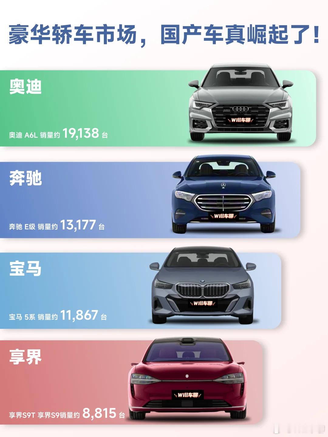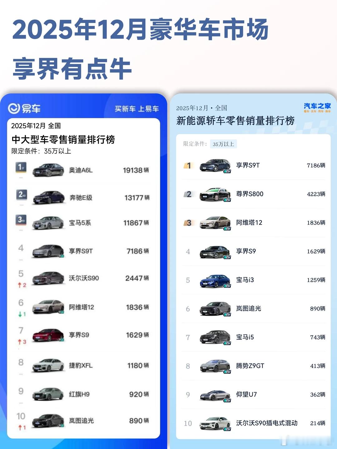 最近在看12月豪华轿车销量的时候,有个变化挺有意思。BBA依然稳坐主流,但在中大型豪华轿车市场里,已经开始出现一个不太容易被忽略的名字。📊2025年12月,享界双车合计销量8815台,刷新品牌单月新高。放在整个豪华轿车市场里看,它的体量已经进入主流视野,开始与宝马5系、奔驰E级、奥迪A6L放在一起讨论,而不再只是“新能源里的小众选项”。🔍 拆分来看,12月 享界S9T销量7186台,享界S9为1629台。对比传统豪华阵营,宝马5系约 11867台,奔驰E级约13177台,奥迪A6L约19138台。差距依然存在,但变化在于——它已经不是“进不了同一张表”的角色,而是豪华轿车里的重要变量。👥 从用户结构看,中大型豪华轿车的需求正在变得更务实。31–40岁成为核心人群,很多人已经“用过豪华”,对品牌光环不再执着,更在意设计、空间、智能化和日常体验是否顺手。这种转变也让传统豪华逐渐被“祛魅”,长期使用的舒适度,开始高于单一品牌符号。例如新时代豪华的享界增换购用户占比持续走高,其中超过70%来自传统豪华品牌。📈 在杰兰路报告中,享界在品牌档次指数和发展信心指数上,已进入“高档品牌、强信心”区间,位置与BBA处在同一档位。⭐ 同时,享界 S9T拿下中大型轿车净NPS推荐值第一,说明在已购用户中,认可度和推荐意愿都不低。从产品角度看,思路并不复杂:🚦 车外:36个全车传感器,搭配华为乾崑智驾ADS 4,强调稳定性和场景覆盖;🚗 车内:零重力副驾、多屏交互和高规格音响,取向更偏长期使用的舒适度。🤔豪华轿车的变化,可能不是“谁取代谁”,而是多了新的选择。如果你现在换车,BBA还会是你的唯一答案吗?享界让豪华轿车市场四分天下享界