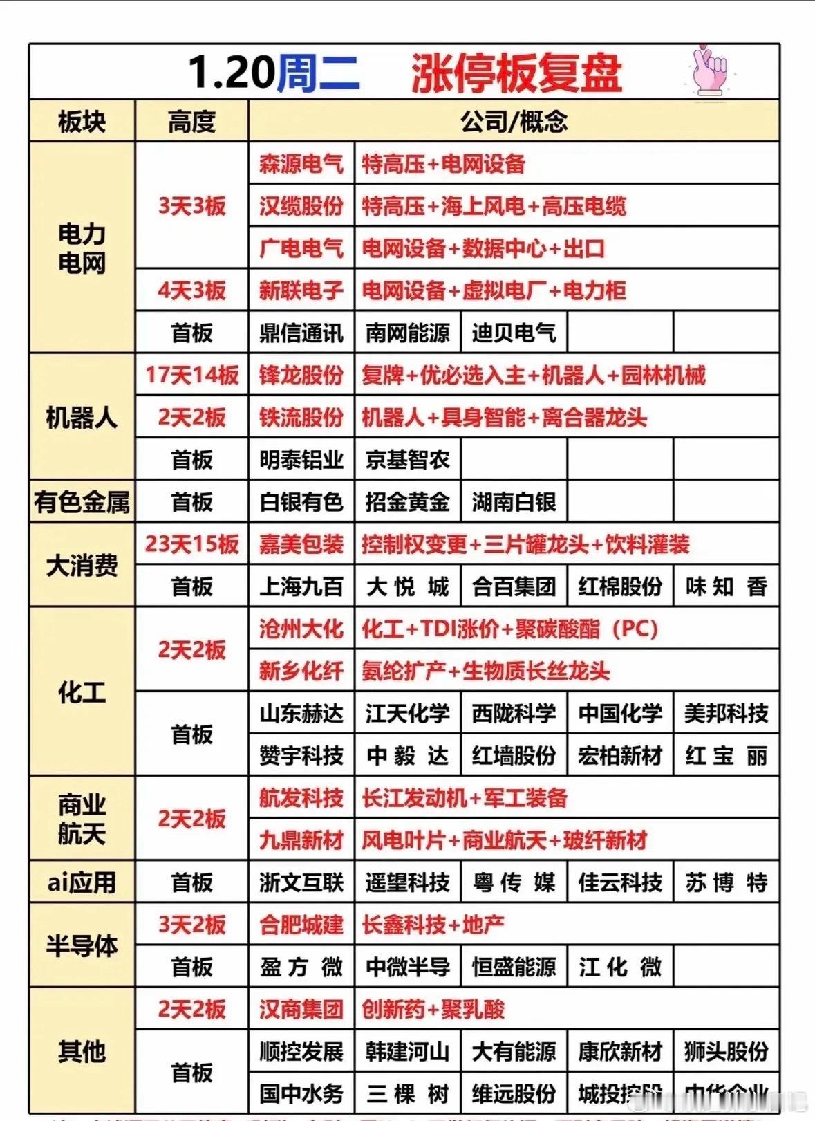 1月20日涨停梯队梳理:情绪活跃,结构性机会凸显个股梳理分析1. 锋龙股份:17天14板市场总高度标,叠加优必选入主、机器人、园林机械概念,资金抱团态势显著,短期情绪溢价充足,后续需关注实控人变更后的业务协同及市场情绪延续性。2. 嘉美包装:23天15板消费板块高度标,聚焦控制权变更+三片罐龙头概念,受益消费复苏与行业需求回暖,资金博弈情绪浓厚,需跟踪新实控人资源注入进度。3. 电力电网板块:批量连板态势亮眼。新联电子(4天3板)主打电网设备+虚拟电厂,订单储备充足;森源电气(3天3板)、汉缆股份(3天3板)、广电电气(3天3板)均聚焦特高压等核心领域,受益于电网投资加码与智能化升级,需关注订单落地及产能释放。鼎信通讯、迪贝电气等首板标的,凭借业务协同与配套优势,承接板块资金流入。4. 机器人板块:结构性机会突出。铁流股份(2天2板)切入具身智能核心零部件,技术壁垒较高;明泰铝业、京基智农等首板标的,分别从材料供应、养殖设备领域切入,受益产业爆发红利,需跟踪客户导入与项目落地。5. 其他热门标的:化工板块沧州大化、新乡化纤(均2天2板)受益产品涨价与需求复苏;商业航天领域航发科技、九鼎新材(均2天2板)依托国产替代与产业链放量,技术优势显著;有色金属(白银有色、招金黄金等)、大消费(上海九百、大悦城等)首板标的充足,分别受益贵金属行情与消费复苏,具备短期情绪溢价。总结当前市场妖股抱团与板块轮动并行,涨停梯队完整,热点虽分散但结构性持续性较强。投资者可结合连板高度、板块景气度与个股基本面筛选标的,同时需警惕短期情绪退潮引发的波动风险。