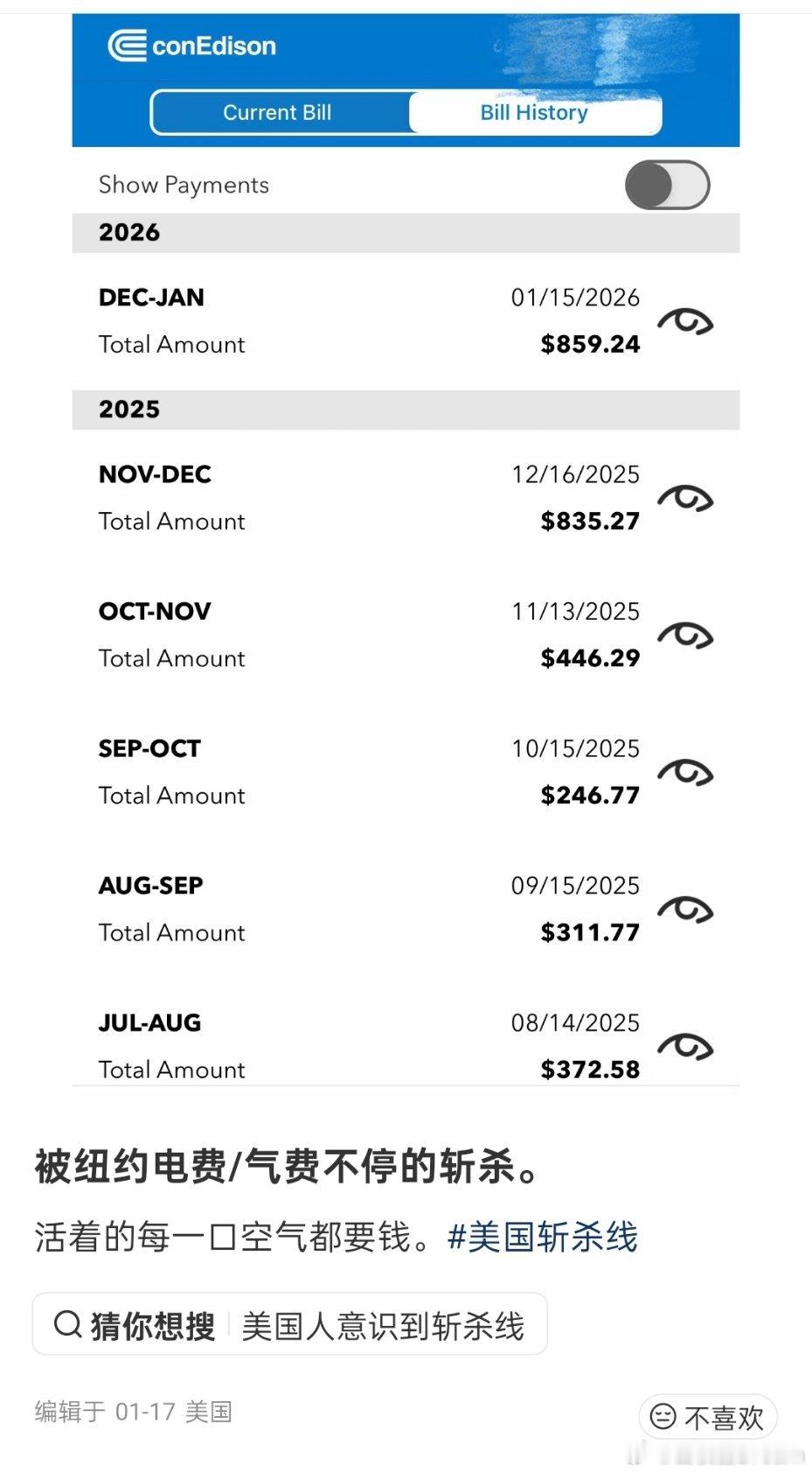 给你们看看美国的电费+气费,一个月就要859美金,要知道大部分美国普通人也就月薪3000的水平。美国斩杀线名不虚传。美财长就斩杀线甩锅拜登海外新鲜事
