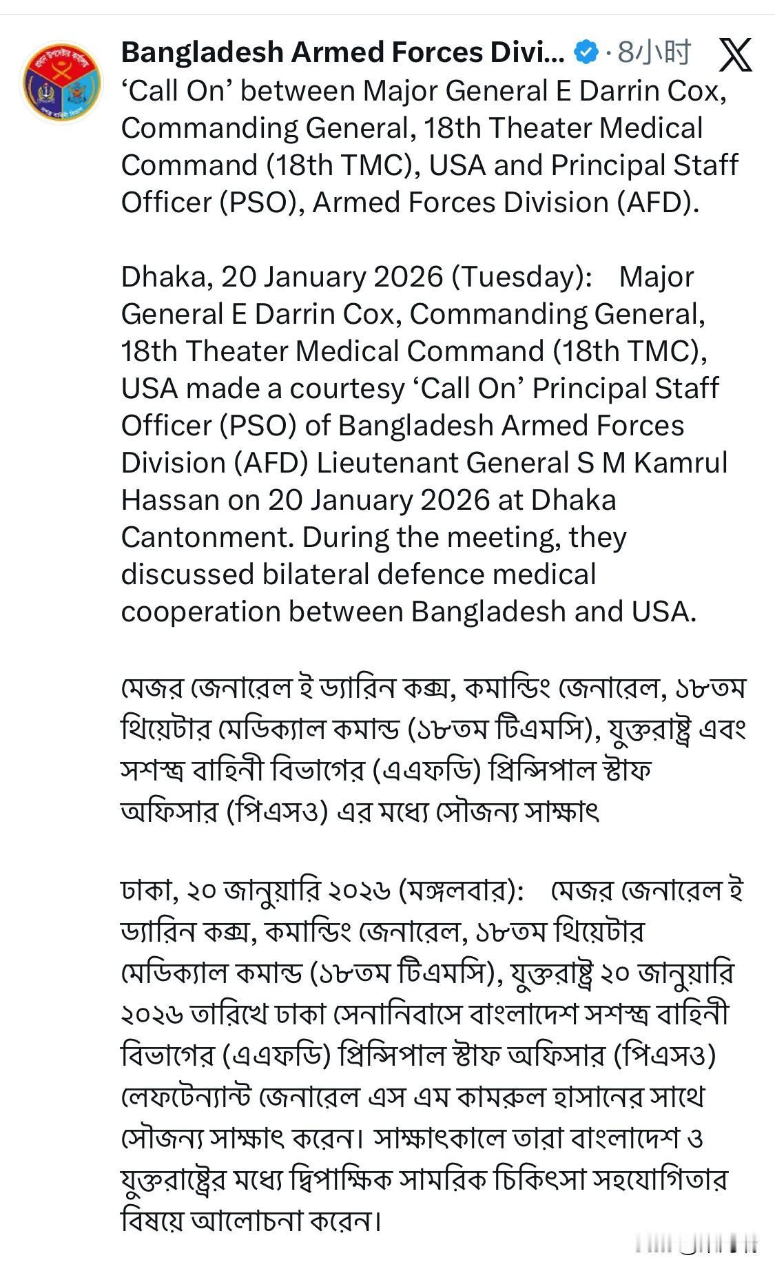 美国第18战区医疗司令部(18th TMC)司令E·达林·考克斯少将于2026年1月20日在孟加拉达卡军营礼节性拜会了孟加拉国武装部队师首席参谋官SM·卡姆鲁尔·哈桑中将。会晤期间,双方讨论了孟加拉国和美国之间的双边国防医疗合作。