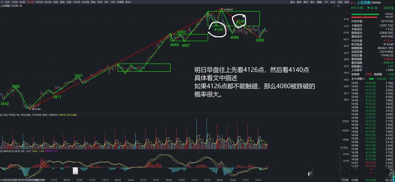 大盘15分钟结构:震荡格局未改,关键点位定方向今日大盘15分钟K线结构与昨日相比并无明显变化,盘中走出清晰的趋势轨迹:从4140点延伸出的绿色下跌笔,精准下探至4080点支撑位后企稳,随即形成向上反弹笔。截至收盘,这一笔向上反弹是否完成尚未有明确信号,后续走势需等待明日盘面进一步验证。明日早盘的关键观测锚点在于4126点,突破该点位后可进一步看向4140点压力位,具体走势可分为三种情形:1. 指数运行于4126点-4140点区间内,后续若出现绿色下跌笔,大概率会下探考验前低4080点,甚至不排除创出新低的可能,这种走势下市场调整压力仍在。2. 指数强势突破4140点压力位,后续即便出现回落下跌笔,创出新低的概率也会大幅降低,此时可视为短期进场信号,止损位可设置在近期低点下方,防范假突破风险。3. 早盘指数连4126点都未能有效突破,说明多头反攻力度不足,新低将是大概率事件,此时不宜贸然进场,需继续观望等待明确企稳信号。需要强调的是,昨日提及的15分钟级别第三类卖点目前仍未形成,这意味着当下大盘仍处于震荡筑底的过程中,形成下跌中枢的概率依旧偏高。整体操作策略上,建议以观察为主,等待结构明朗后再择机而动,避免在震荡格局中盲目操作。