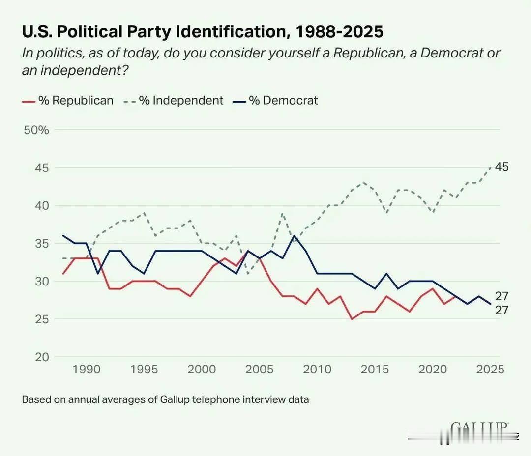 越来越多美国人正用行动对两党政治投下不信任票。最新民调显示,近一半的成年人自认为是政治独立选民,这一比例创下新高。而且不仅是年轻一代,从X世代(通常指1965-1980年出生人群)开始,独立派就已成为主流;相比之下,认同共和党的人和认同民主党的人,比例各自都不到三成。 这种情况直接体现在民意循环中:无论哪一党执政,支持率都会快速流失,独立选民会迅速倒向对手,导致国会与总统职位频繁“翻盘”。特朗普—拜登—特朗普的执政交替,并非选民善变,而是因为选民对两个政党都不满,只能在不喜欢的选项中轮流进行“惩罚”。 结果便是,没有任何一个政党能建立长期稳定的多数优势,政治愈发极化,治理能力却愈发脆弱。在这样的背景下,多数美国人认为,美国需要一个真正的第三政党选择。 问题在于,制度本身把大门关得很死:“胜者全拿”的选举制度、选区划分规则以及选举法规,让新政党几乎没有生存空间。关键在于推动制度改革,例如在众议院引入比例代表制和多席位选区,让不同政治立场的群体都能依据得票比例进入国会,进而被迫展开协商、组建联盟,而非永远陷入零和对抗的僵局。 (数据源自网络,仅供参考)