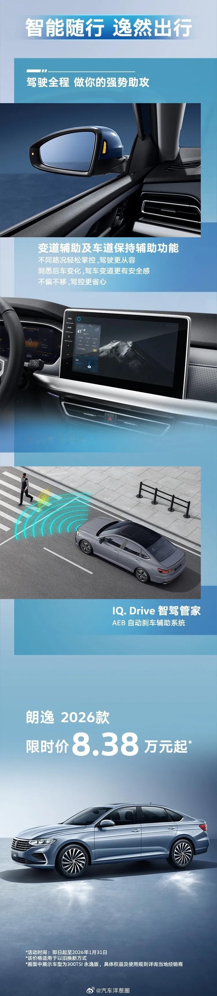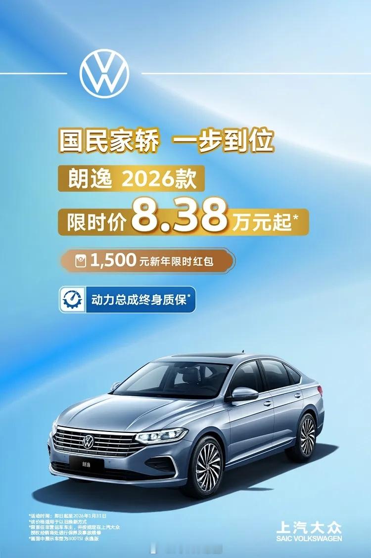 2026款大众朗逸上市,限时价8.38万元起指导价12.09-14.39万;限时价8.38万元起。燃油 紧凑型轿车车长4678,轴距26881.5L+6AT(110马力)1.5T+7DCT(160马力)动力总成终身质保IQ.Drive辅助驾驶AEB自动刹车辅助系统变道辅助+车道保持指示灯IQ.智慧车联12英寸中控屏(高配)前排主驾座椅6向电动调节(顶配)前排加热功能(顶配)打孔皮革包覆座椅(顶配)大家觉得这台车的性价比如何?大众朗逸葱爆新车朗逸