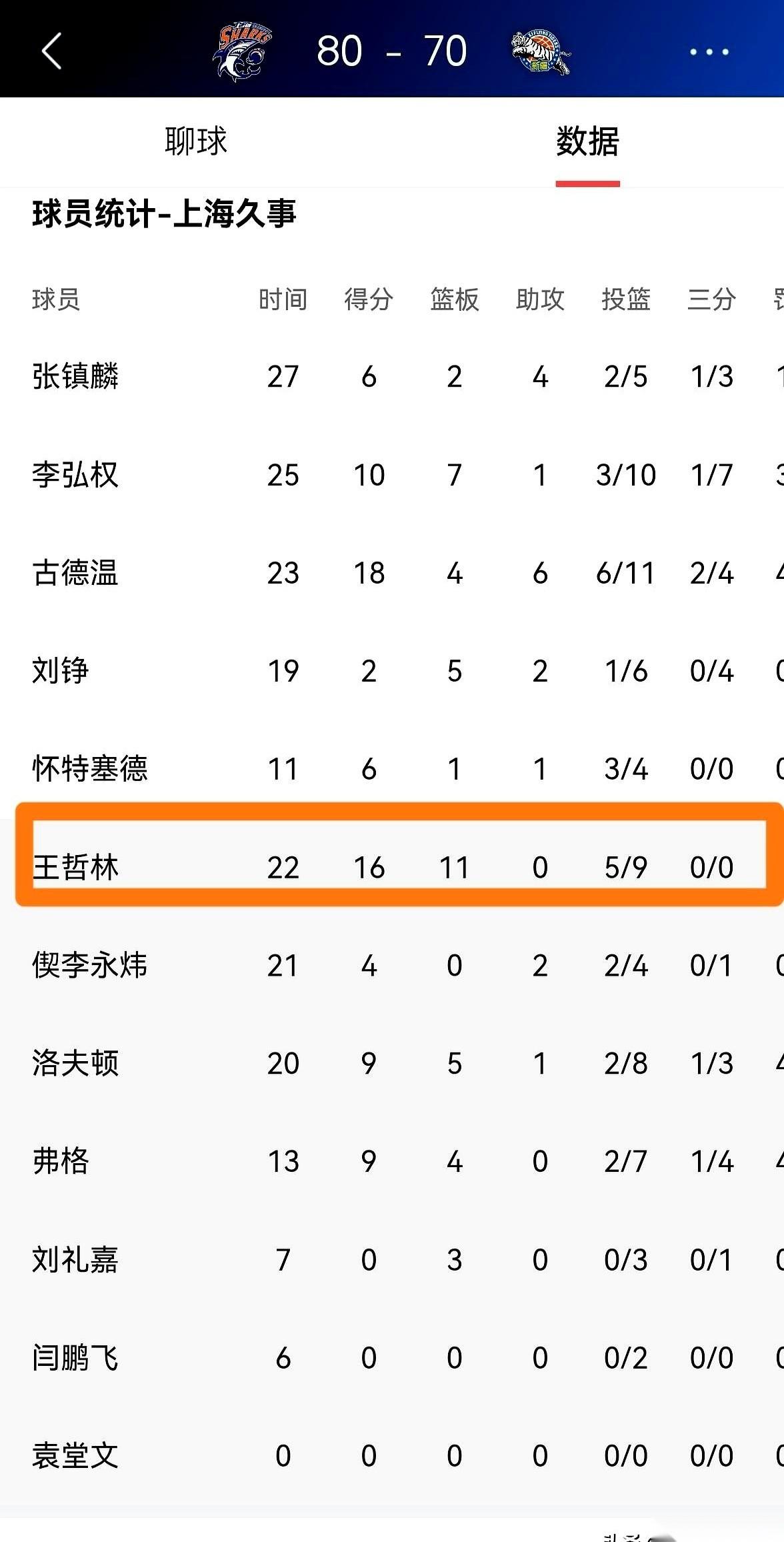 讲个恐怖故事: 王哲林,替补出战22分钟。 在场净胜21分。 这意味着什么? 意味着他不在场的那26分钟,上海队是输球的,而且输了整整11分。 一上,一撤,天翻地覆。 我真的,看到这数据的时候,后背有点发凉。 这已经不是什么“定海神针”了,这简直就是这支球队的“开关”啊。 他在,灯就亮,他下场,直接拉闸。 都说大王有时候打球情绪化,关键时刻指望不上。 可今天这比赛,你再看看。 罚球6中6,稳得像座山。篮下那股狠劲儿,就是要硬生生把你凿穿。 这哪是软?这是把所有的劲儿,都用在了刀刃上,一滴都不浪费。 他可能不再是那个场场30+20的常规赛MVP了。 他变成了一把更锋利的,也更懂得何时出鞘的刀。 这就够了。 对现在的上海队来说,这就够了。