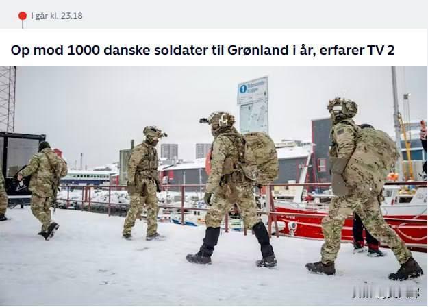 丹麦计划一年内向格陵兰调派多达1000名军人 丹麦广播电视台TV2消息,丹方政府正考虑向该岛派遣至多1000名军人。 此前哥本哈根方面已向格陵兰调运了军事装备并派遣先遣部队。 该电视台指出,目前已有约150名军人抵达坎克尔苏阿克基地参演,努克也进驻了约同等数量的军人。