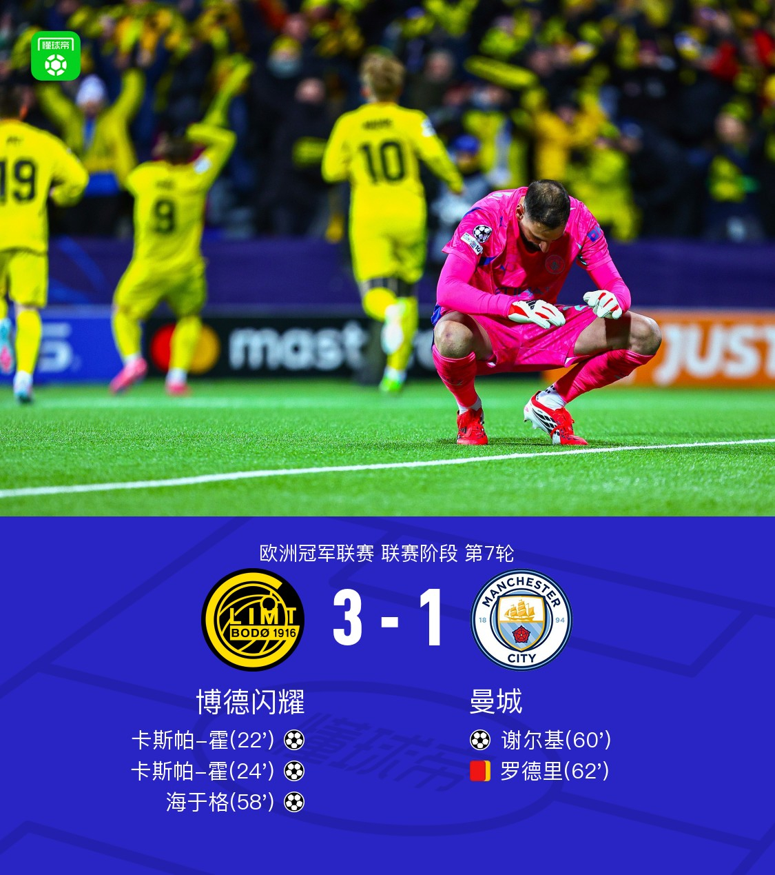 爆大冷!曼城1-3博德闪耀,卡斯帕-霍两分钟两球,罗德里染红博德闪耀3-1曼城博德闪耀vs曼城欧冠