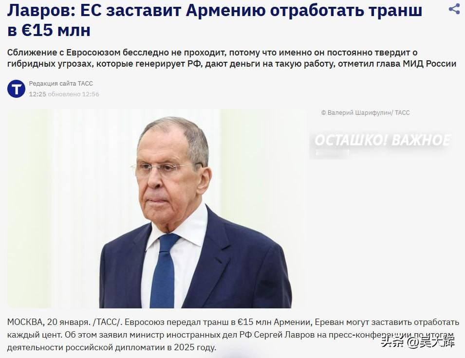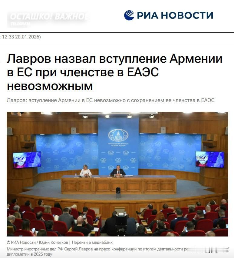 【拉夫罗夫:亚美尼亚必须二选一,无法同时加入欧盟与欧亚经济联盟】 俄罗斯外长拉夫罗夫在2025年俄罗斯外交工作成果新闻发布会上表示,“朝着欧盟成员国身份推进的举动,显然无法与继续留在欧亚经济联盟并存。” “正如帕希尼扬先生所言,若亚美尼亚依据亚美尼亚人民的意愿作出相关决定,这是亚美尼亚和亚美尼亚人民的权利……当然,最终的选择应由亚美尼亚人民和亚美尼亚领导层做出。但同时参与两大联盟,是完全不可能的。” 拉夫罗夫还指出了欧盟与亚美尼亚关系中反俄的层面:“欧盟不断宣称俄罗斯制造混合威胁,还为相关反俄活动提供资金支持。” 在评论亚美尼亚使徒教会相关争议时,拉夫罗夫称,“近期欧盟刚向亚美尼亚拨付了1500万欧元的援助款,我确信,布鲁塞尔的官僚们会逼着我们的亚美尼亚友人把每一分钱都花在刀刃上(为欧盟的诉求效力)。”
