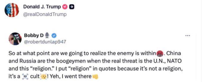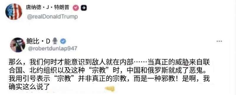 特朗普今天(北京时间1月21日)转发的一段话:“我们何时才能意识到敌人就在内部......当真正的威胁来自联合国,北约组织以及这种‘宗教’时,中国和俄罗斯就成了妖怪(Boogeyman)。我用引号表示‘宗教’并非真正的宗教,而是一种邪教。” [机智]评几句:“敌人都是从内部瓦解的”这句话在特朗普的转发中得到荒诞印证:一边将联合国、北约等自身体系内的伙伴视作“内部威胁”,甚至乱扣“邪教”帽子,暴露其同盟体系的内部分裂;一边又继续翻炒“中俄威胁论”,把中俄塑造成假想的“妖怪”,实则是掩盖自身内政困局与同盟失和的惯用伎俩。这种对内撕裂阵营、对外转嫁矛盾的操作,不过是为其激进政策找借口,既暴露了美国主导的国际秩序的内部裂痕,也让所谓“威胁叙事”显得虚伪又可笑,终究难以掩盖其自身才是破坏共识、制造混乱的根源。