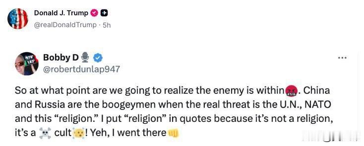 【威胁是联合国与北约并非中俄:特朗普转性?】 唐纳德·特朗普在真相社交平台转发一则消息,称美国面临的真正威胁是联合国和北约,而非中国与俄罗斯: “我们何时才能认清,威胁本就藏于内部?中国和俄罗斯不过是唬人的稻草人,真正的威胁,是联合国、北约,还有那所谓的‘宗教’——这根本不是宗教,而是邪教。”