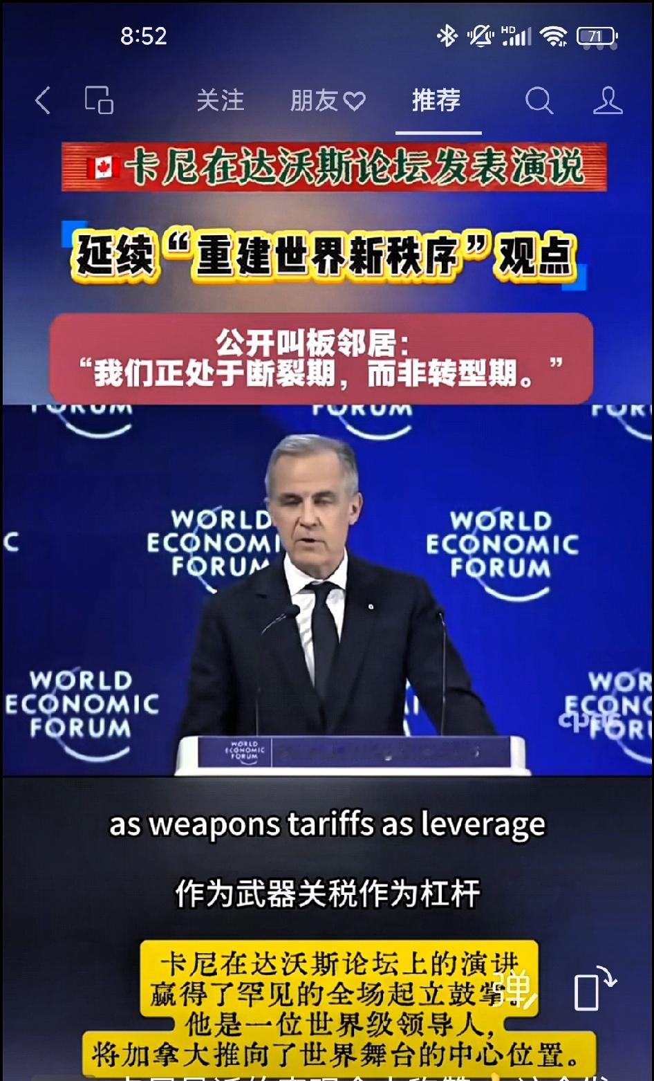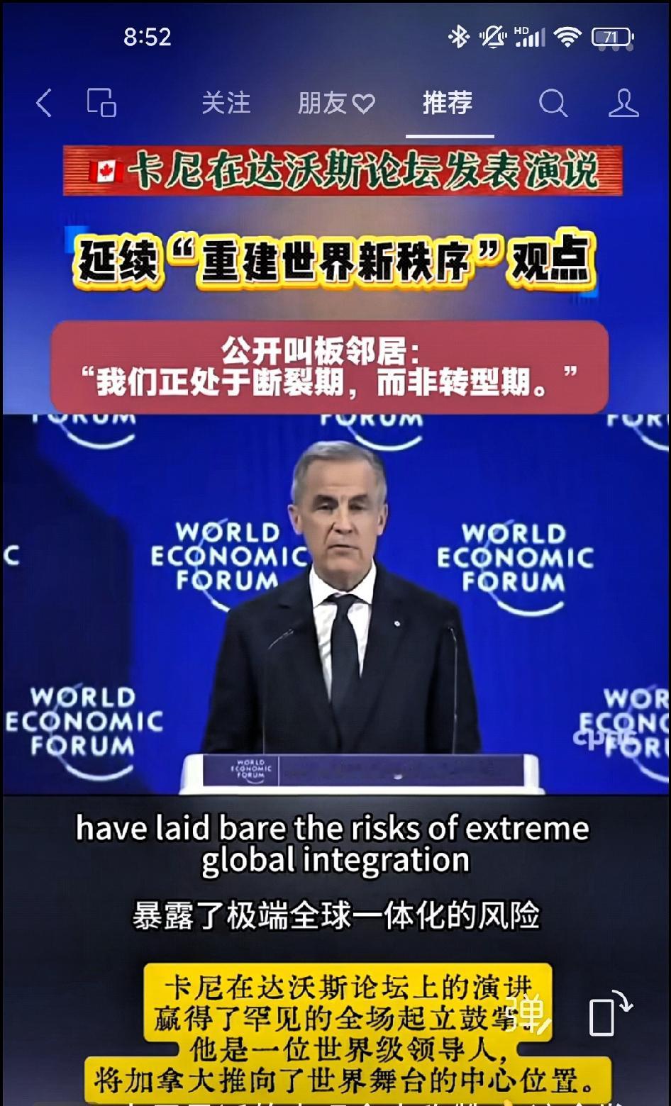 加拿大总理卡尼在达沃斯经济论坛发表演说:延续“重建世界新秩序”观点! 让我直截了当一点,我们正处于破裂,而不是过度之中。在过去的20年里,一系列金融危机,健康危机,能源与地缘政治暴露了极端全球一体化的风险。 但最近某些大国已经开始利用经济一体化作为武器。关税作为杠杆,金融基础设施作为胁迫,供应链作为可利用的漏洞。 你不能生活在互利的谎言中。