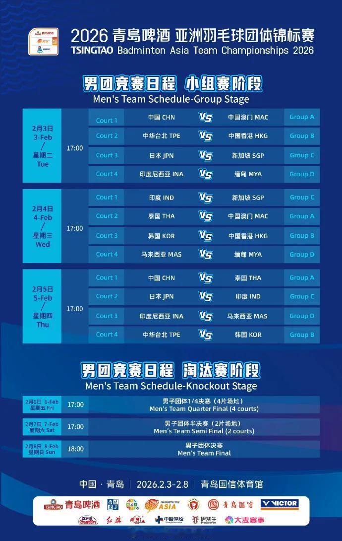 国羽男团:2月3日对阵中国澳门打响头炮,2月5日硬碰泰国全力冲关 国羽女团:2月4日迎战小组赛独苗对手马来西亚,剑指开门红 每一拍扣杀都凝聚热血,每一次起跳都承载期待! 为国羽助威“团”集结,我们青岛赛场见 附男团小组赛完整赛程 附女团小组赛完整赛程