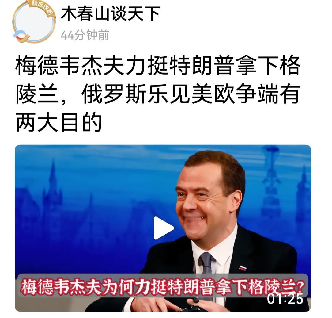 梅德事杰夫拱火不恹事大,力挺特朗普拿下格陵兰。因为他知道,美欧冲突越大,越有利于俄罗斯火中取栗,不仅战胜乌克兰,而且可以恢复苏联的疆域或荣光。欧洲国家最怕的是美俄暗中结盟,达成共识,美国放弃乌克兰以换取俄罗斯支持美国吞并格陵兰。