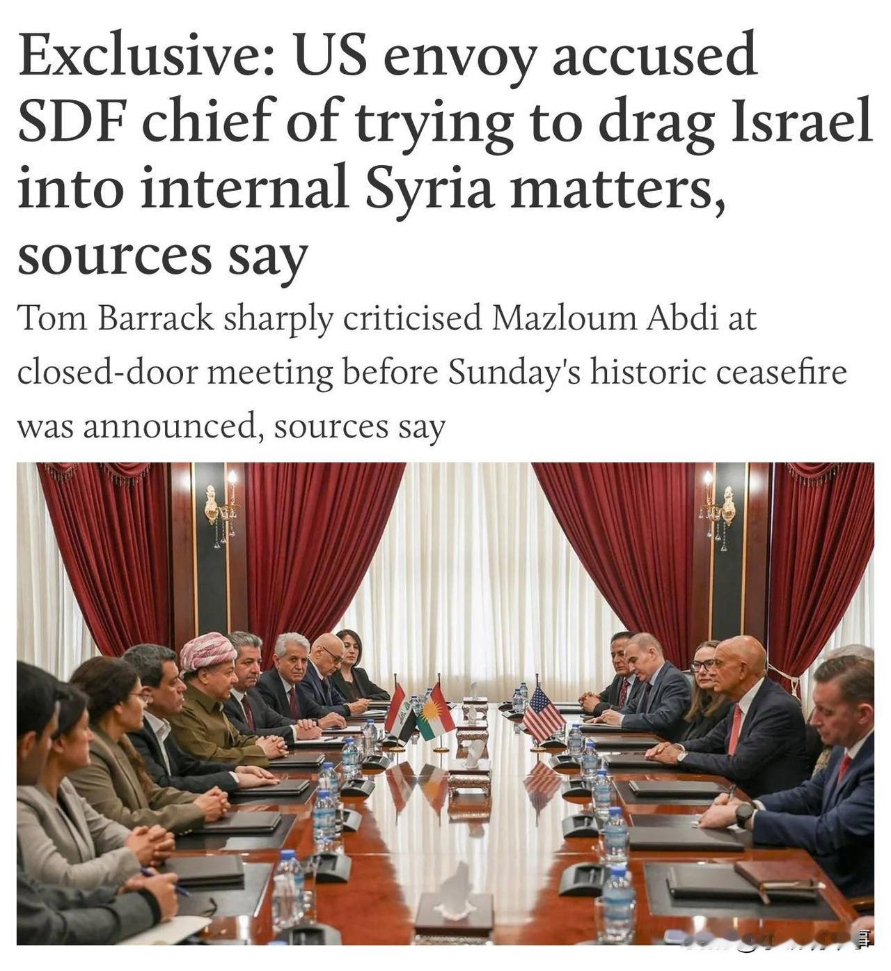 据《中东之眼》报道,美国叙利亚问题特使汤姆·巴拉克在伊拉克北部城市埃尔比勒举行的闭门会议上严厉质问库尔德主导的“叙利亚民主军”司令马兹鲁姆·阿布迪,指责他试图将以色列拖入叙利亚冲突,并警告称这种举动既危险又不可接受。 ➡️巴拉克表示,让以色列介入可能会导致“毁灭性后果”,并可能引发土耳其与以色列之间的严重摩擦,而这两个国家都是美国的重要盟友。 ➡️他还批评阿布迪拖延执行2025年3月达成的将叙利亚民主军纳入叙利亚现政府(过渡政府军)的协议,指责“叙利亚民主军”领导层拖延时间、依赖外国势力,并表现得好像阿萨德时代从未结束一样。 ➡️巴拉克强调,叙利亚现政府现在是美国在反恐方面的合作伙伴,并表示“叙利亚民主军”必须适应叙利亚新的政治现实。