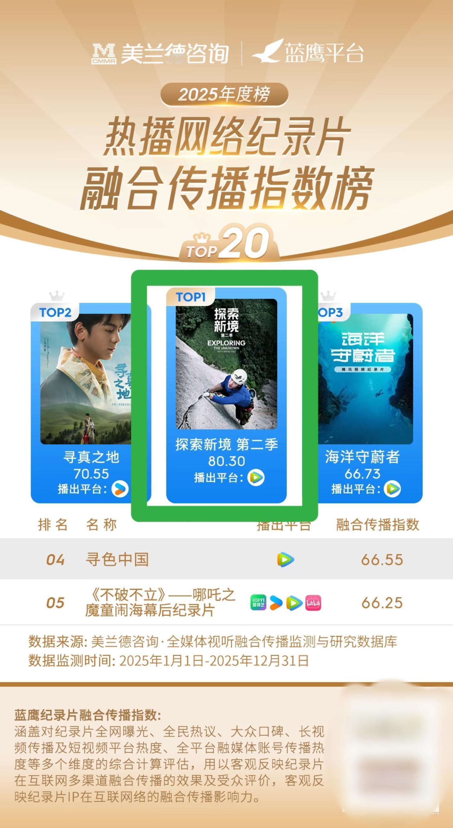 王一博 2025年热门网络纪录片,探索新境2断层第一。