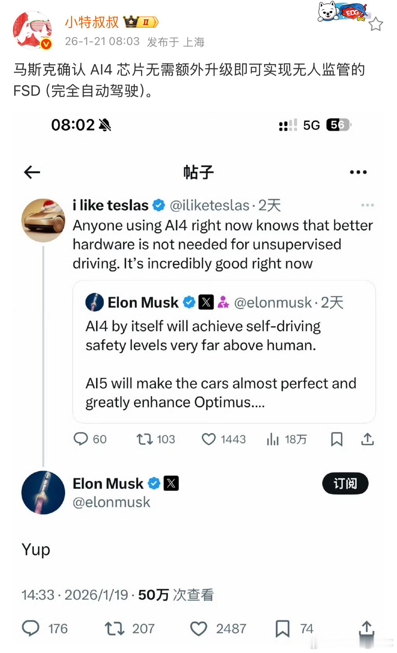 马斯克确认,现在焕新3/Y用的AI4芯片,不用升级就足够实现无人的完全自动驾驶。昨天浅试了Model 3P的FSD,整体表现也超出预期。它的行驶判断很接近真人驾驶思路,识别精准度和反应速度都在线。遇到风险时处理得比较平稳,不会有急刹的突兀感,还能提前预判路况变道。只是不知道国内的完整版什么时候才能落地啊特斯拉