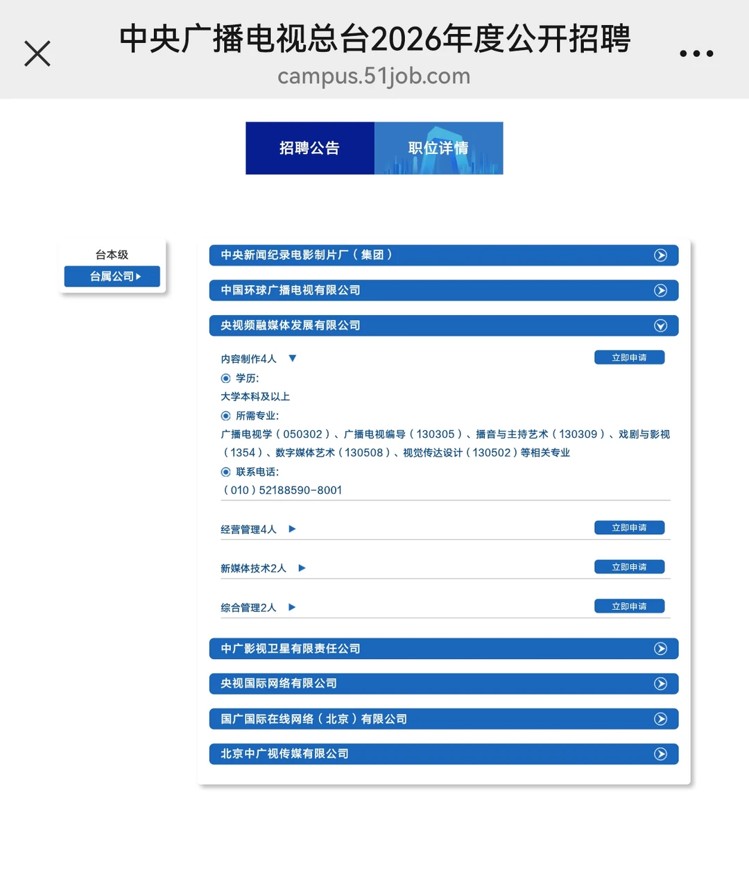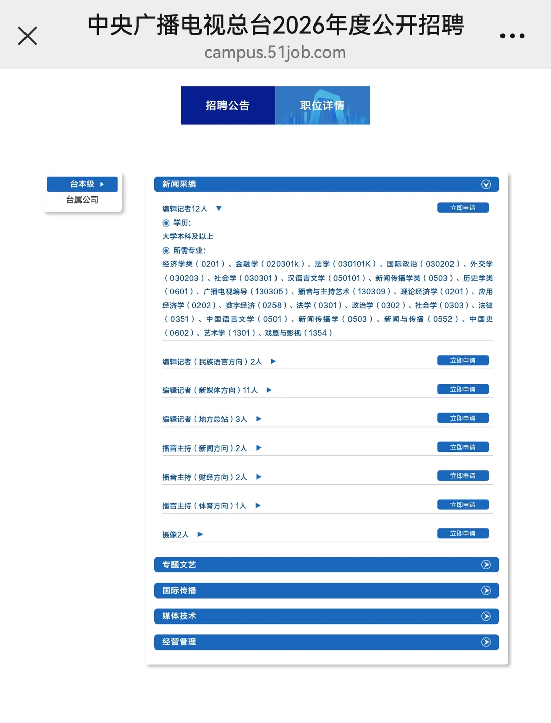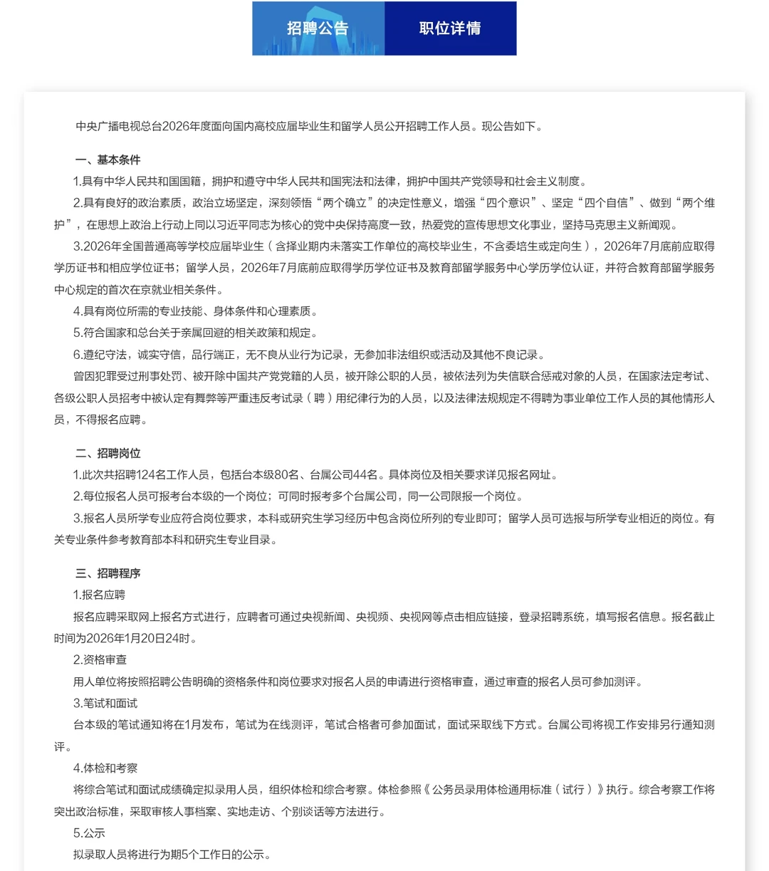 ✅中央广播电视总台2026校园招聘来啦!这次真不是演习!近三年来开的最早的一年,又在年前把招聘通知发出来了!让孩子们安心过个节吧,真的。。。 👉本次招聘共招收124名应届毕业生,其中台本部(台聘)80名,台属公司44名,待遇丰厚 👉本次招聘面向2026届国内外应届毕业生(含两年择业期未就业),其中所有岗位均面向留学生同学开放,不区分京内外生源,所有同学机会均等! 👉具体岗位如图所示,大家可以自行登陆官方网站查看!节后给大家开直播解析!别着急选岗奥