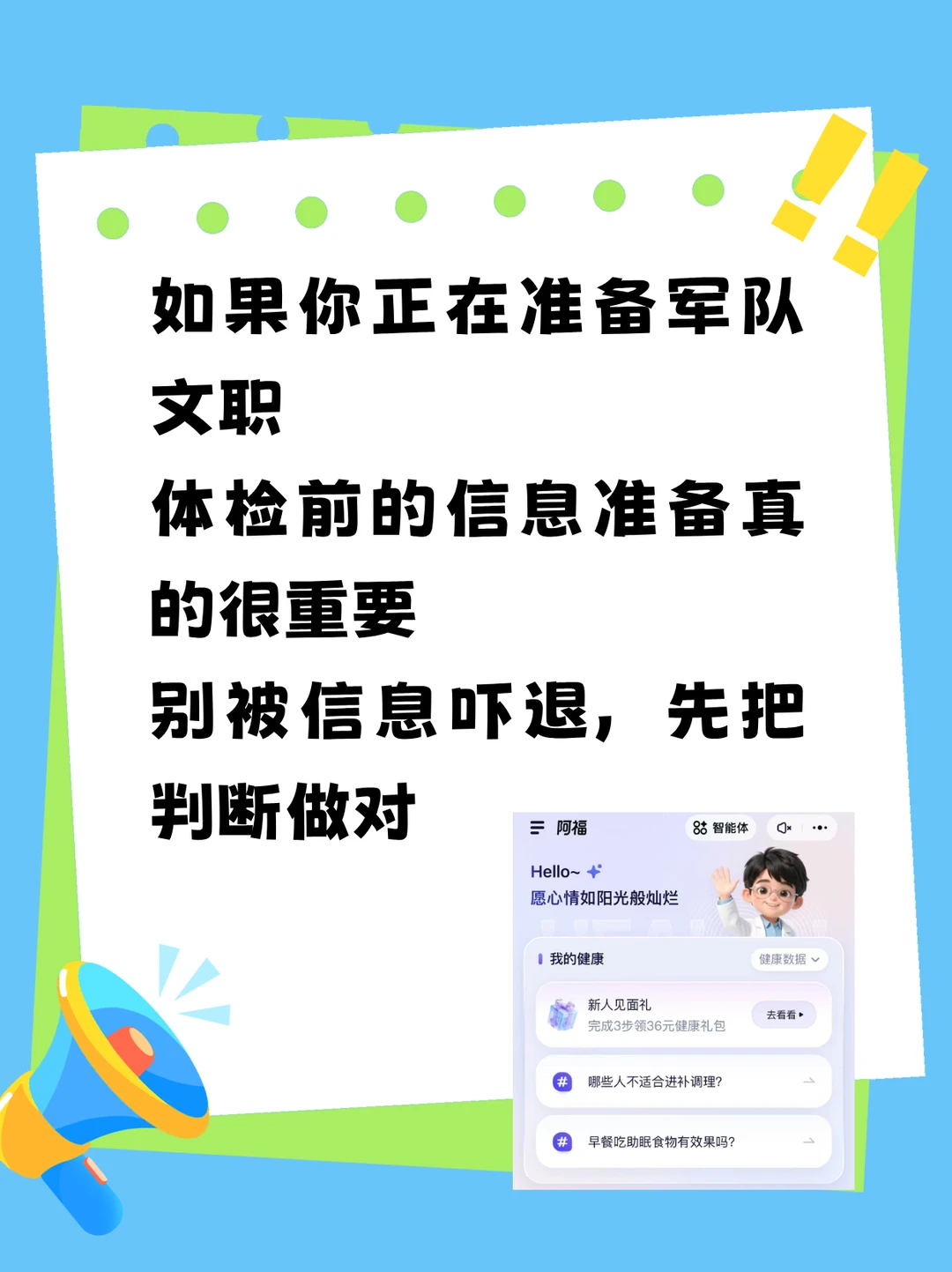 如果你也在准备军队文职体检,或是关心直招军官体检标准,真的可以先用阿福问问看。它能帮你提前理清问题、准备好材料,稳稳过关。