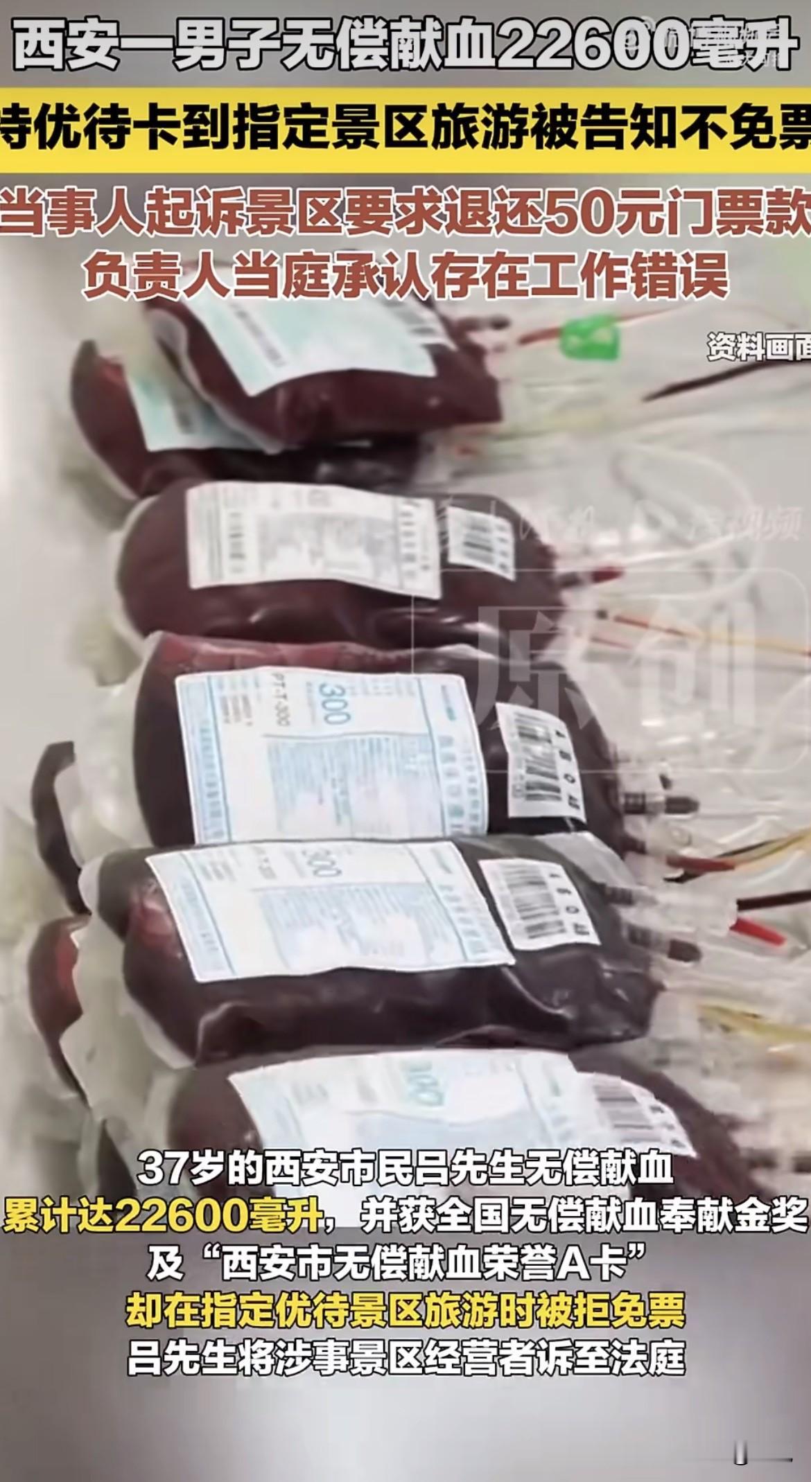 2025年12月21日,吕先生带着父母来到西安赵公明文化景区。他掏出那张红色的荣誉A卡和身份证,递到售票窗口。工作人员瞥了一眼,冷冷地回了句:“没接到免票通知,买票吧。” 吕先生愣住了。这张卡是《西安市献血条例》给的承诺,白纸黑字写着可免市属A级景区门票。他献血二十多年,57次,2.2万毫升,相当于把全身的血换了四五遍。如今,这50块钱的门票,像一盆冷水浇下来。 他看着身后年迈的父母,压住火气,付了钱。但那股委屈和较真劲儿上来了。他决定告。 2026年1月19日,周至县人民法院开庭。庭审上,景区负责人当庭承认了错误,说工作没做到位,同意退那50块钱。但退钱还要等判决书下来,走财务流程。 据《西安市献血条例》,献血累计三千毫升以上即可免费游览市属A级景区。而荣誉A卡持卡人更是明确享受“免收大唐芙蓉园、西安城墙等市属A级景区首道门票”的待遇。赵公明文化景区,正在此列。 一场官司,为的远远不是50块钱。它要讨的是一个理,是一个承诺到底算不算数。 政策给了献血者荣誉和实惠,但到了景区门口,怎么就卡住了?是通知没下发,还是根本就没当回事?法律判了,错认了,钱答应退了,但以后呢?别的景区会不会照样“没接到通知”? 一张小小的荣誉卡,承载的是社会对善举的回馈。当它被轻易推开时,推开的可能还有更多人的热心。 这件事,你怎么看?