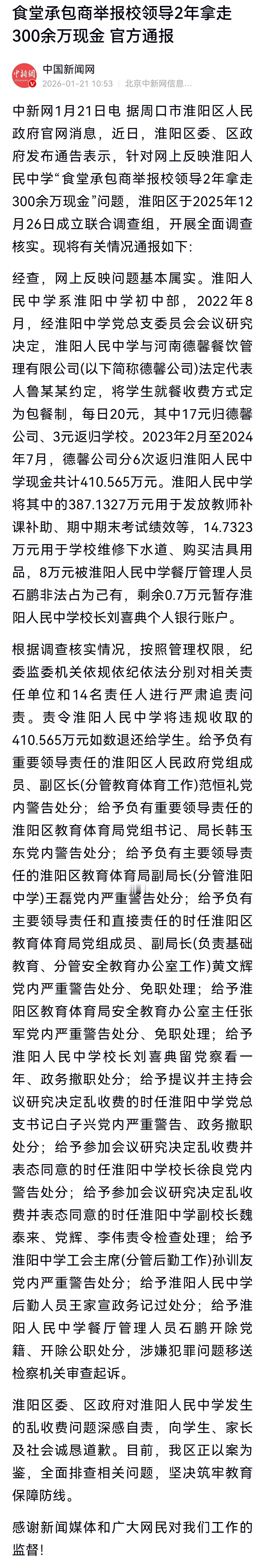 这个抽成决定是学校领导集体做出的,可见没人把规范食堂经营(承包)的规定当回事。有多少学校违规乱收费,是通过集体决策实施的? 抽成的大部分费用用于给教师发补课补助以及期中期末考试绩效奖金,教师们知道这些费用来自学生餐费抽成吗? 另外,义务教育学校禁止违规补课,该校组织的补课,属于什么性质?是不是学校用违规收取餐费提成,进行违规补课,而上级部门对此视而不见?除了餐费抽成违规外,对于学校存在的其他违规行为也应该一并进行追查。