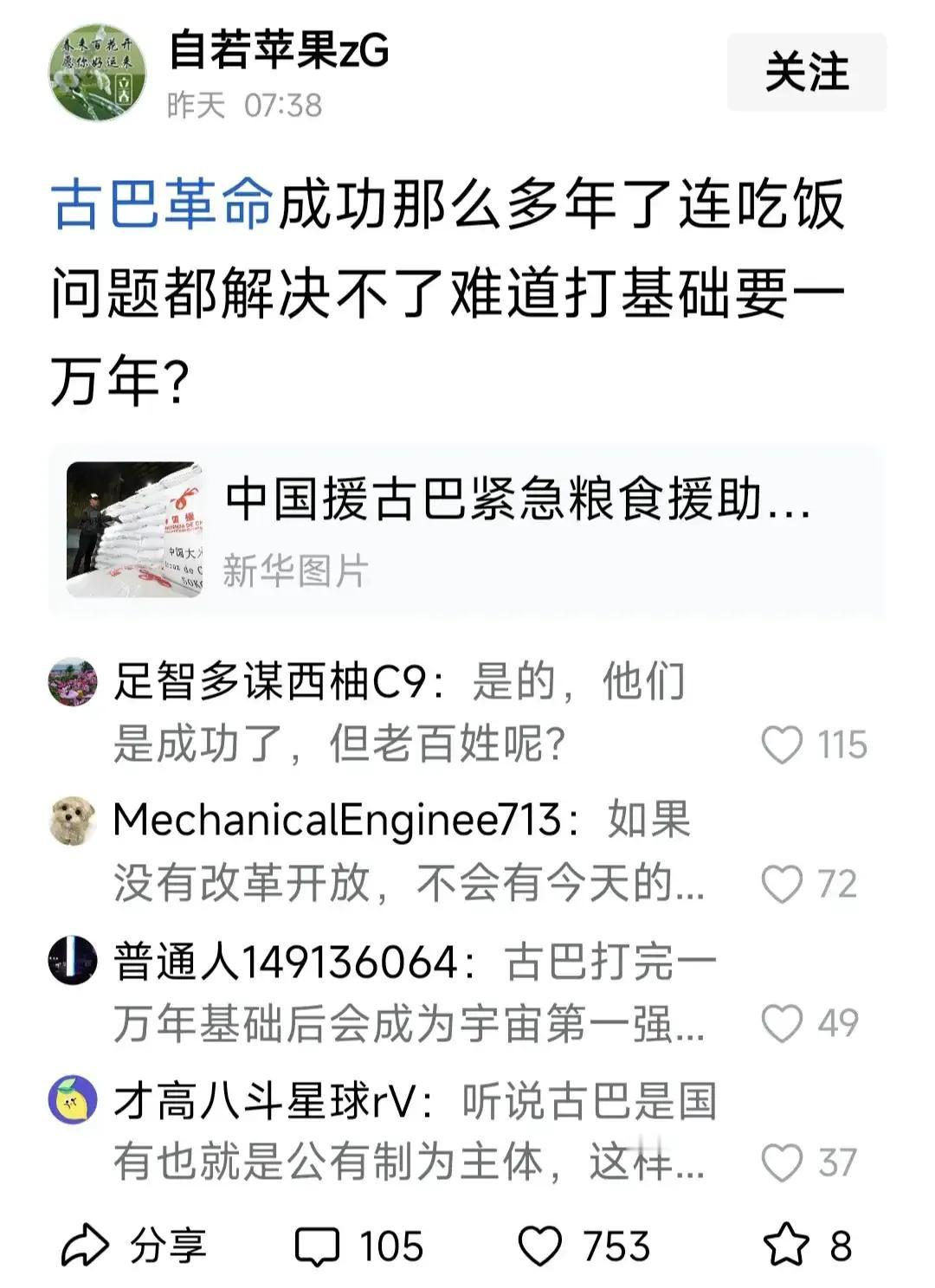 他们有些人说话有点片面了,立场也站错了。 有的人不看历史,只看现实。 不问原因,只看结果。 只知其一,不知其二。 不问正义,只看说的拳头硬。 只看一点,不及其余。没有国家利益大局观,一味拿古巴制度说事是别有用心了。 古巴被美国封锁,制裁几十年,那个国家受得了,何况是小国古巴,这已经很厉害了,也说明了国家的团结一致。 大家怎么看?