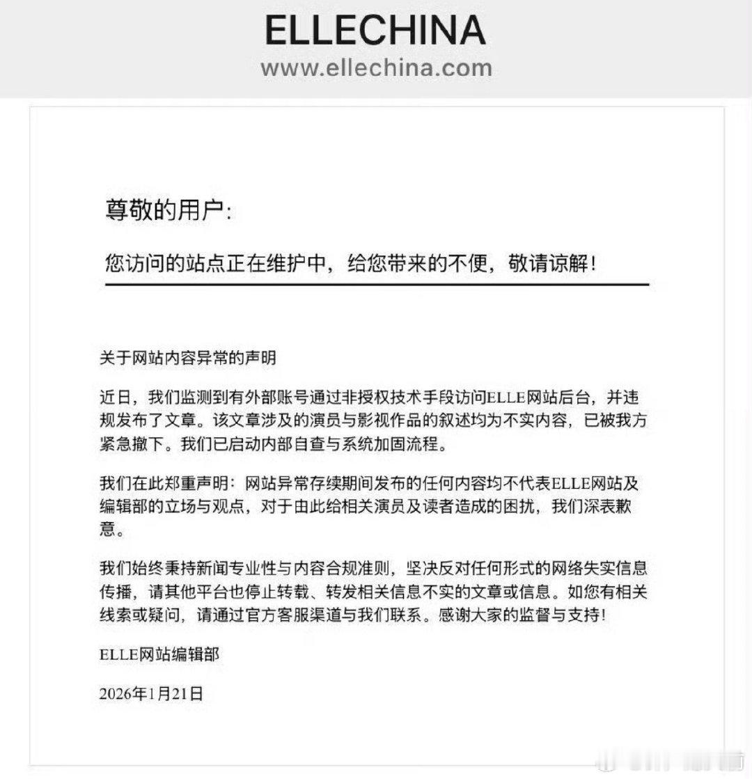 ELLE官网说有账号黑进他们后台并违规发布文章太恶劣了,支持elle报警彻查ELLE 影视创作须回归本源