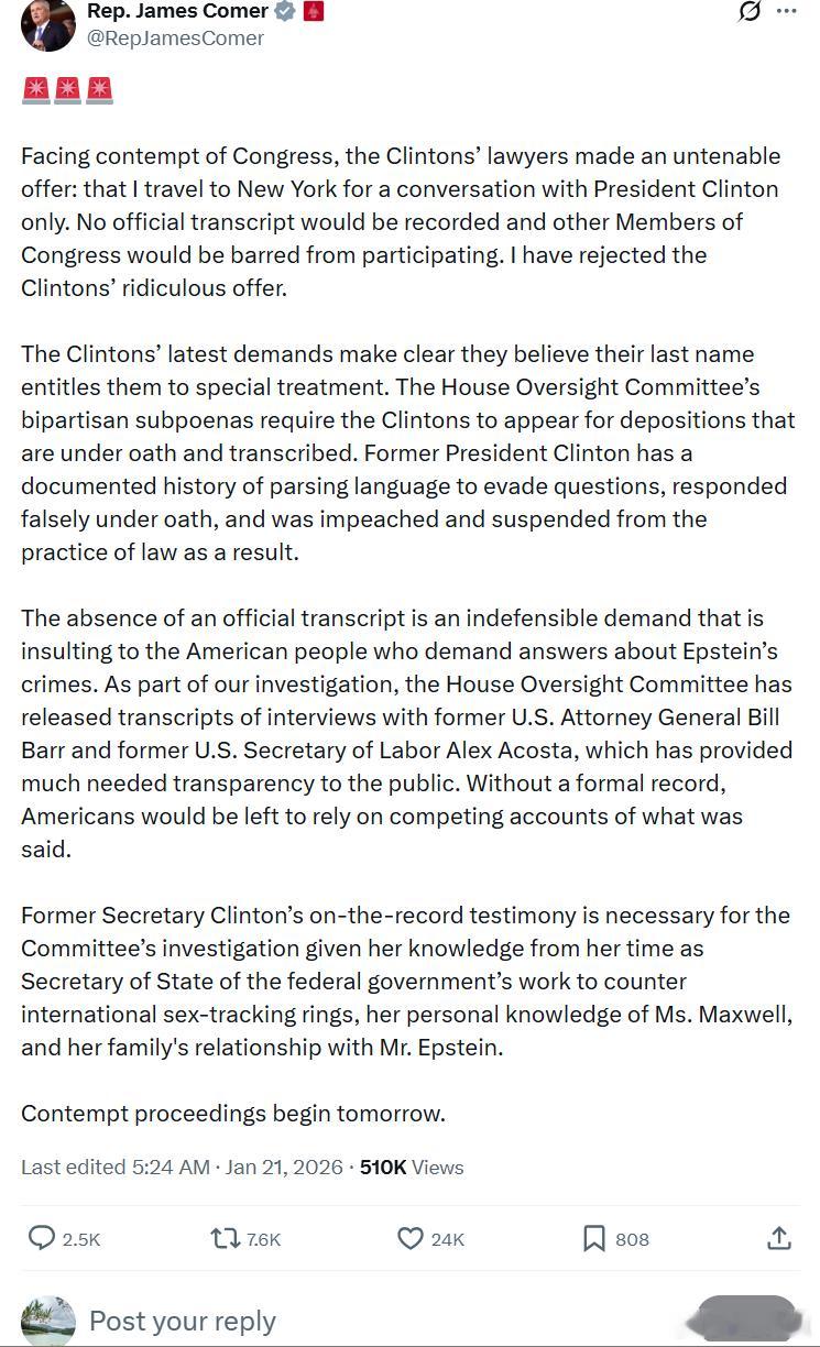 国会议员詹姆斯·科默表示克林顿夫妇藐视国会的相关程序将于明天启动:“面对可能被以藐视国会论处的局面,克林顿夫妇的律师提出了一个站不住脚的条件:要求我前往纽约,只与克林顿总统本人进行一次‘谈话’。不会有任何正式文字记录,而且其他国会议员将被禁止参与。我已经拒绝了克林顿方面这一荒谬的提议。克林顿家族最新提出的要求清楚表明,他们认为自己的姓氏让他们有资格享受特殊待遇。众议院监督委员会发出的两党一致支持的传票,要求克林顿夫妇宣誓作证并接受正式、可记录的证词问询。前总统克林顿有据可查地曾通过玩弄措辞来回避问题,并且曾在宣誓作证时作出虚假陈述,因此遭到弹劾并被暂停律师执业资格。拒绝留下正式文字记录是一项毫无正当性的要求,也是对要求就爱泼斯坦犯罪问题得到答案的美国人民的侮辱。作为调查的一部分,众议院监督委员会已经公布了前司法部长比尔·巴尔和前劳工部长亚历克斯·阿科斯塔的访谈文字记录,为公众提供了亟需的透明度。如果没有正式记录,美国人只能依赖彼此矛盾的说法来判断当时究竟说了什么。鉴于希拉里·克林顿在担任国务卿期间对联邦政府打击国际性人口贩运网络工作的了解,她对麦克斯韦尔女士的个人认识,以及其家族与爱泼斯坦的关系,她公开、在案的证词对委员会的调查至关重要。藐视国会的相关程序将于明天启动。”