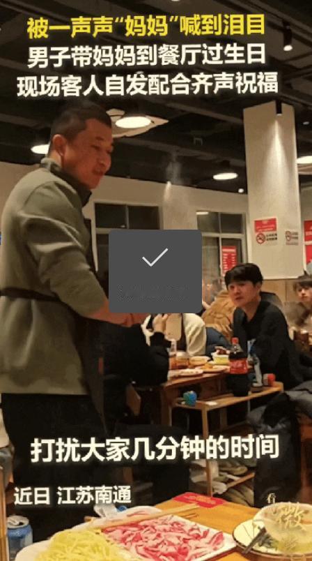 “火到人民日报了!”江苏,一男子带着妈妈到餐馆过生日,不料吃到一半男子突然站起来,对着店里所有用餐的客人,提出了一个请求,妈妈直接被感动到落泪。 江苏,近日,一名男子特意抽时间,带着妈妈来到一家餐馆,只为给妈妈过一个简单又有意义的生日。 餐馆里座无虚席,满是烟火气,食客们各自低头享用美食、轻声闲聊,一切都显得格外平常,男子和妈妈找了个靠窗的位置坐下,点了一桌子妈妈爱吃的菜,安安静静地用餐,氛围温馨又惬意。 妈妈一边吃着菜,一边笑着和男子说着家常,脸上满是欣慰的笑容,看得出来,能有儿子陪着过生日,她格外开心。 她一辈子勤俭朴素,从来没有过过什么隆重的生日,对她来说,儿子的陪伴,就是最好的生日礼物,哪怕只是一顿简单的餐馆饭菜,也足够让她满心欢喜。 男子看着妈妈眼角的皱纹和鬓边的白发,心里满是感慨,妈妈一辈子为家里操劳,默默付出,从来不计回报,如今自己长大了,总想给妈妈多一点温暖,多一点惊喜,让她能感受到被珍视、被宠爱。 他思索再三,心里悄悄盘算着一个小计划,想给妈妈一个难忘的生日回忆,只是这个计划,需要在场所有陌生食客的配合。 吃到一半,男子突然放下手中的筷子,深吸一口气,缓缓站起身来,脸上带着一丝腼腆,却又格外坚定。他转过身,目光缓缓扫过餐馆里所有用餐的客人, 原本喧闹的餐馆,因为他这个突如其来的举动,瞬间安静了下来,食客们纷纷停下手中的动作,将目光投向他,眼里满是疑惑,不知道这个年轻人要做什么,男子的妈妈也愣住了,一脸茫然地看着他,眼里满是意外。 男子没有丝毫犹豫,也没有多余的铺垫,直接对着满屋子的陌生客人,说出了自己的请求,语气真挚又诚恳,他希望大家能配合自己,等他对着妈妈大声喊出“妈妈”之后,在场的所有人,能一起齐声送上“生日快乐”的祝福,给妈妈一个惊喜。 他话音刚落,原本安静的餐馆里,瞬间响起了热烈的掌声和叫好声,没有一个人拒绝,也没有一个人敷衍,满屋子的客人都欣然应允,邻桌的客人还笑着竖起大拇指,眼神里满是鼓励和善意,原本互不相识的陌生人,因为这个简单的请求,瞬间有了默契。 感受到大家的善意和配合,男子心里一暖,再次深吸一口气,转过身,目光温柔地投向身边的妈妈,用尽全身的力气,大声喊出了一声“妈妈”,那一声呼唤,里面积满了对妈妈的爱意和感恩,清晰又有力量,传遍了餐馆的每一个角落。 几乎就在男子喊出“妈妈”的瞬间,全场的客人立刻齐声喊出“生日快乐”,一声接一声,整齐又响亮,充满了真诚的祝福,没有丝毫的敷衍,那温暖的声音,回荡在整个餐馆里,驱散了冬日的寒意,也瞬间击中了妈妈的心。 妈妈看着眼前这一幕,看着儿子坚定的眼神,听着满屋子陌生人真挚的祝福,眼眶瞬间就红了,原本脸上的笑容,渐渐被感动取代,眼泪再也忍不住,顺着脸颊慢慢滑落下来。 她一边用手轻轻擦拭着眼泪,一边不停向周围的客人点头致谢,脸上满是腼腆又幸福的神情,那泪水,不是委屈,不是难过,而是被宠爱、被善意打动的幸福泪水。 男子拿出手机,悄悄记录下这感人的瞬间,镜头里,妈妈的笑容格外灿烂,眼里还挂着未干的泪痕,食客们的脸上也满是善意,整个餐馆里,都弥漫着温暖与治愈的气息。 这段视频被发到网上后,迅速走红,短短时间内就收获了无数点赞和转发,甚至被人民日报转发报道,得到了全网的称赞。 有人说,这才是最动人的孝心,不张扬、不刻意,却藏着最真挚的爱意;也有人说,陌生人的善意最治愈,一群互不相识的人,因为一个简单的请求,送出最真诚的祝福,这就是人间最美好的样子。 这段暖心视频截至目前,全网播放量已经突破千万,无数网友被这份孝心和善意打动,纷纷留言送上祝福。 对此,你们有什么看法,欢迎评论留言~
