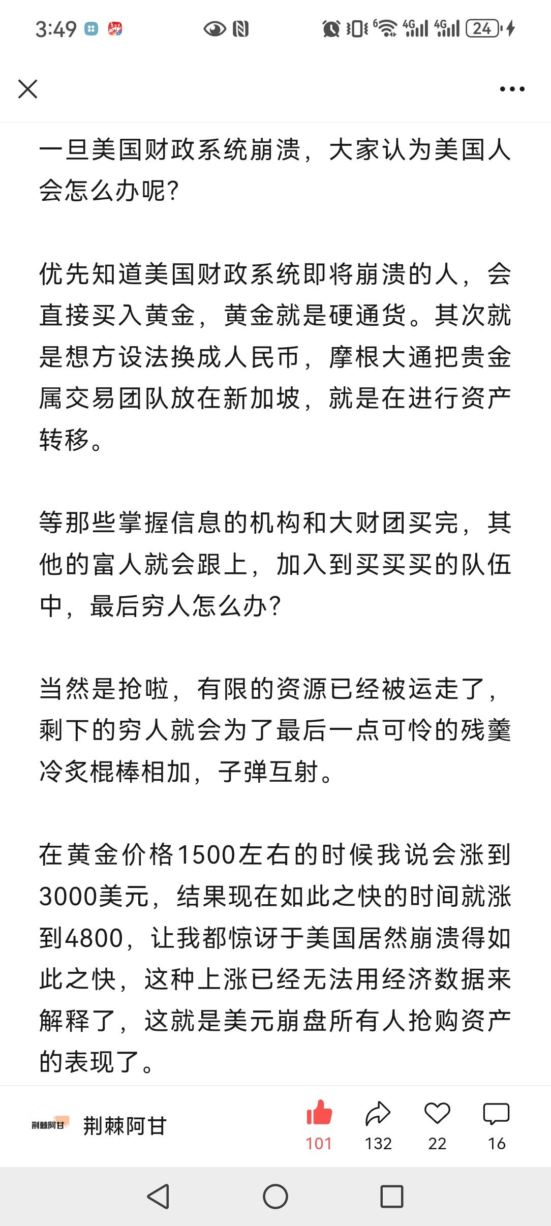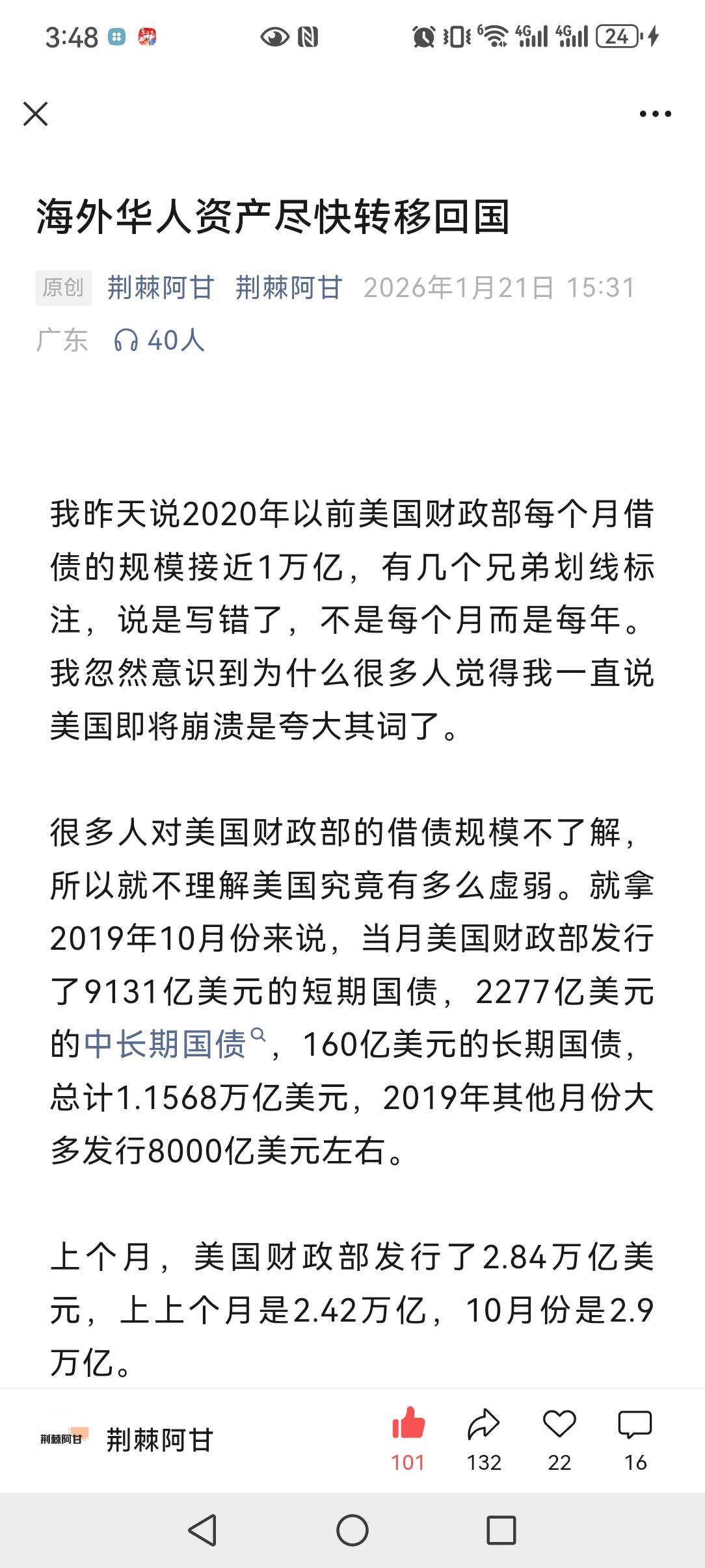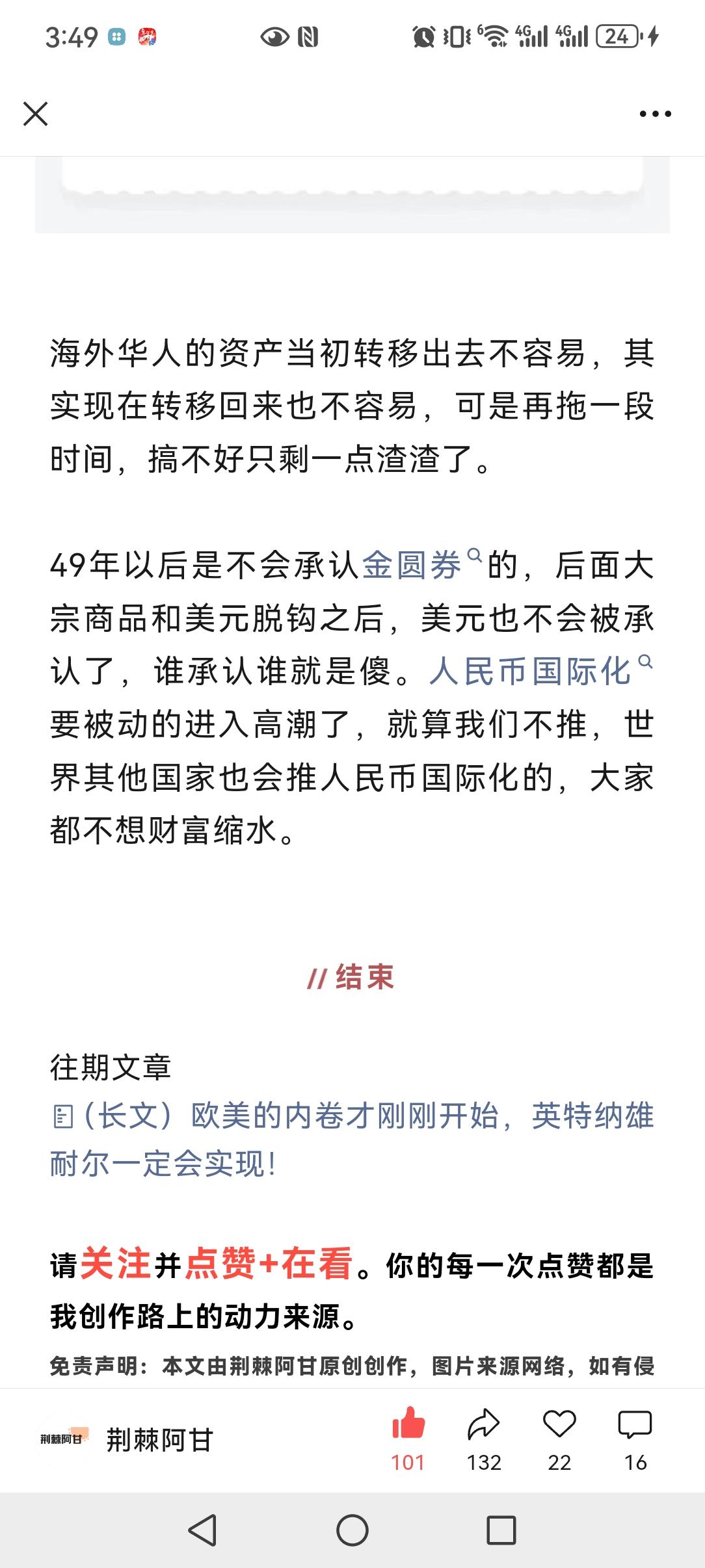 美国现在进入崩溃的疯狂时期,特朗普会越来越激进,因为留给他的时间不多了,国外有资产的人现在必须马上把资产转移回来,海外华人的资产当初转移出去不容易,现在转移回来也不容易,能转移多少是多少,可能再拖一段时间后面搞不好渣都不剩了。 美元即将会被大规模抛售,就像49年的金圆券谁承认谁就是大傻子。人民币国际化要被动进入高潮了,不想财富缩水就赶紧撤回来!