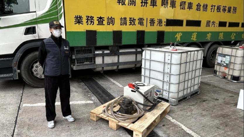 #香港打击非法燃油活动#海关及消防处过去两周采取联合行动“击破”,打击非法燃油活动。其间,在屯门捣毁一个以汽车美容作掩饰的非法加油站,查获一辆正在卸载未完税汽油的跨境货车。该车涉嫌利用非法改装油缸,将未完税汽油偷运入境。整个行动共查获7辆涉案车辆,检获约67,100公升非法燃油,市值约310万元,拘捕10男2女。 消防处警告,非法加油站未安装加油站专用消防设备,一旦发生火警或爆炸,后果严重,会对自身及公众构成高度危险。