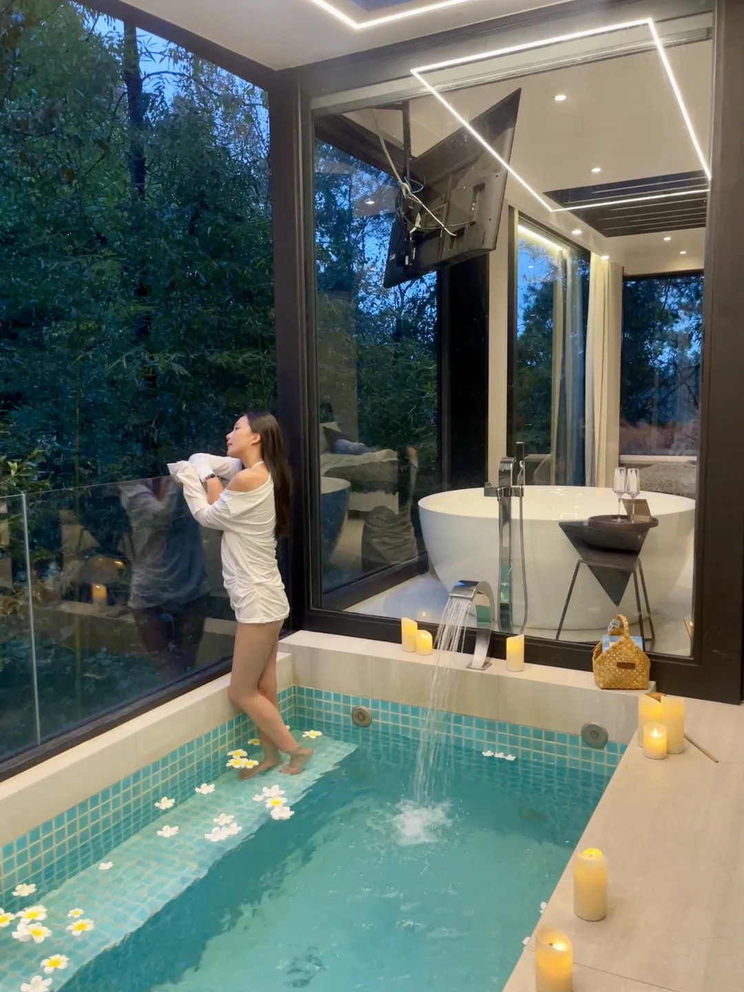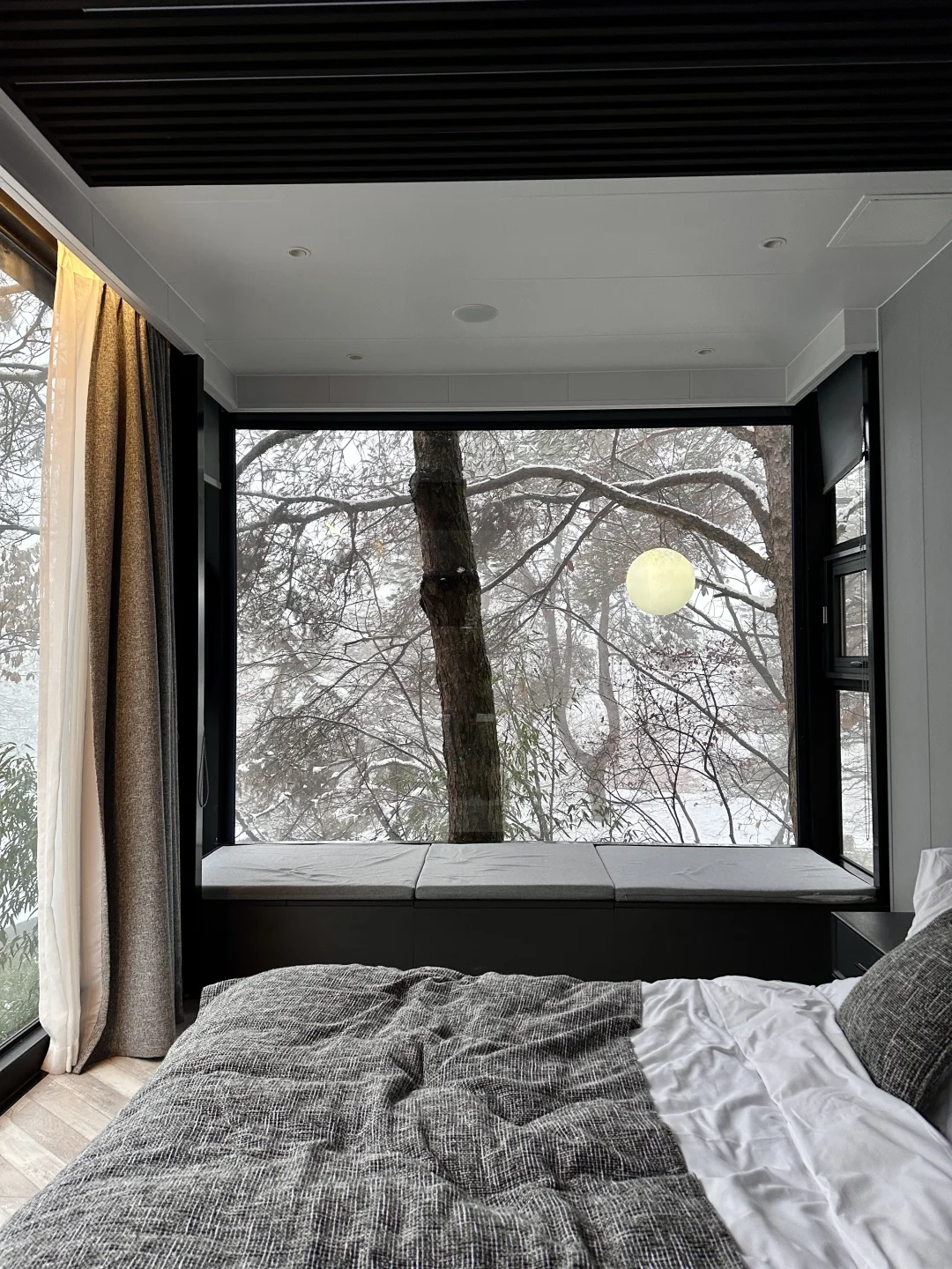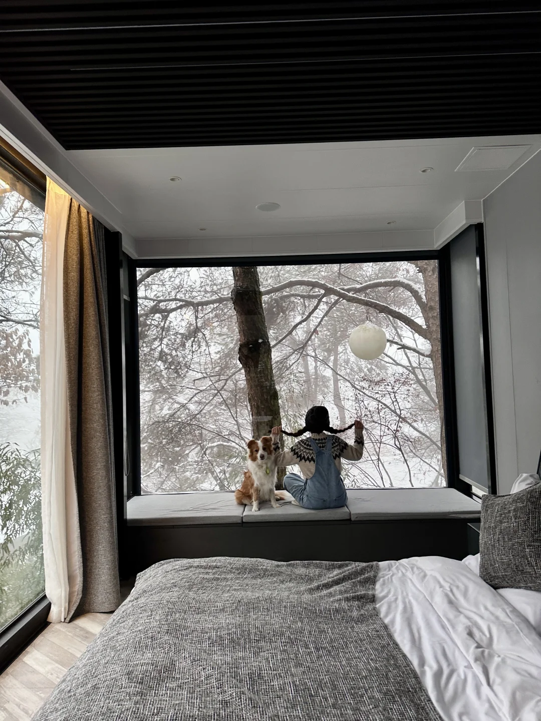 谁懂啊!冬天和闺蜜躲进700米海拔的山巅民宿,推窗就是漫天飞雪❄️ 这才是冬日限定浪漫吧~ · 被「听涛」的景观狠狠拿捏了!270°全景落地窗直接把松林雪景搬进房间,美院设计的黑钢结构,暖乎乎的灯光一照,氛围感直接拉满🌲 两人裹着同一条毛毯窝在丝涟床垫上,看着雪花落在松枝上,听着风过松林的簌簌声,连聊天都变得慢悠悠的~ · 重点是房间自带天然山泉私汤!外面冰天雪地,池子里暖意融融,泡着汤喝着热红酒,雾气氤氲中看雪花飘落,所有疲惫都被治愈了✨ 戴森吹风机、老板亲自设计的洗漱包,细节满到忍不住尖叫,拍照发圈被问爆链接~ · 民宿里还有KTV、台球畅玩,晚上能和闺蜜看露天电影、玩桌游,饿了有管家准备的老母鸡汤和时令蔬菜,真的太暖心啦! · 📍地址:云漫松间 🏠房间:听涛 · 这个冬天别再乱跑啦,和闺蜜来听涛房型赴一场雪与暖汤的约会,把浪漫焊在回忆里~