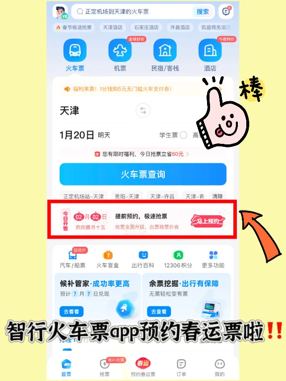 选好日期、车次和座位后一键预约,开启“预约春运车票”,还能解锁Al候补算法,就算没抢到也能智能候补,成功率大幅提升‼️