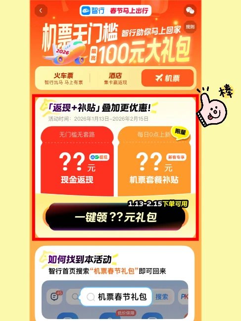 🧧智行的“春节机票礼包”一定要领!!!最高无门槛100元直接使用,叠加平台低价,省下来的钱能炫顿大餐,它不香么~