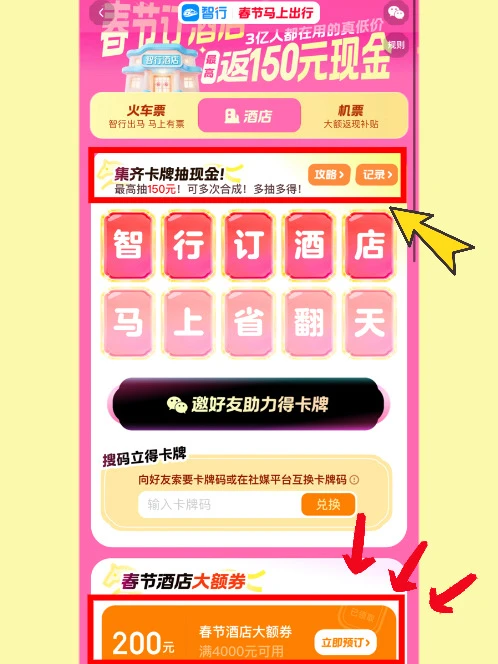 🥳现在我已经预约成功2月14号的火车票,就等出票通知啦!酒店的集卡返现活动顺手参与了一下,没想到已经返了88元,真的太惊喜了~ 还没集齐的可以👇自行交换