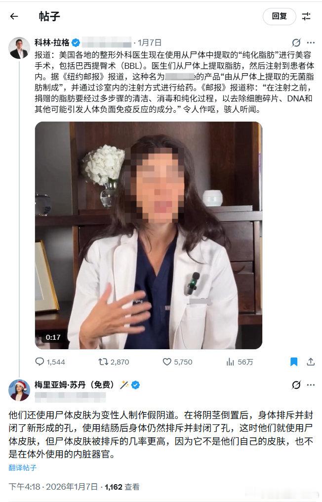 🔻美国恶心的整容手术,脂肪原料来自尸体。🔻美国整形医生从尸体中提取的“纯化脂肪”进行美容手术,然后注射到患者体内。美国现在连尸体脂肪都不放过海外新鲜事