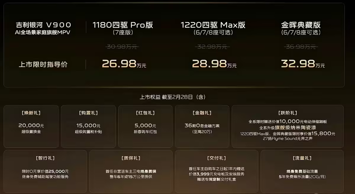 吉利银河V900全球上市26.98万起吉利银河V900,我觉得是当下MPV市场里的一个非常香的选择,因为能给的,吉利基本都安排上了,空间够大,外观也足够大气。辅助驾驶方面还配备了激光雷达和智驾小蓝灯,搭载千里浩瀚辅助驾驶 H5 方案。舒适性配置上,采用了云感 SPA 座椅,并且支持加热、通风、记忆和 SPA 级按摩等功能。动力方面则是搭载了1.5T 发动机与双电机组成的增程动力系统。综合续航分别为 1180km 和 1220km。像 CCD 电磁阻尼、空气悬架及主动魔毯悬架系统这些也都到位了。最主要的是它的上市限时指导价为26.98万元起。