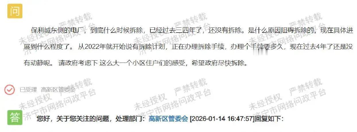 济宁高新区保利城东边的那个老电厂,居民们盼了四五年,至今还没拆,闹心得很。2022年就传出要拆的消息,说手续在办,可四年过去,厂子还立在那,烟囱灰尘天天飘,小区里住着几万人,空气质量、生活环境都受影响,大家意见很大。 官方最新答复是,厂里的资产正按国有资产处置流程一步步走,处理完才能正式启动拆除。之前有消息提到,这应该是华能高新热电厂,机组逐步关停,新电厂投运后老厂才彻底退出,部分回复还说年底前可能全部关停,但实际推进慢,招标挂网了,等接手公司进来再动真格。 这事拖太久,主要卡在资产处置环节,国企老厂涉及设备、土地、职工安置等多重问题,一刀切不了。居民盼望干净天空很正常,但政府也得依法合规走程序,避免国有资产流失或后续纠纷。希望高新区加快进度,早点给周边小区一个交代,让大家住得舒心点。早拆早好,环境改善才是硬道理。