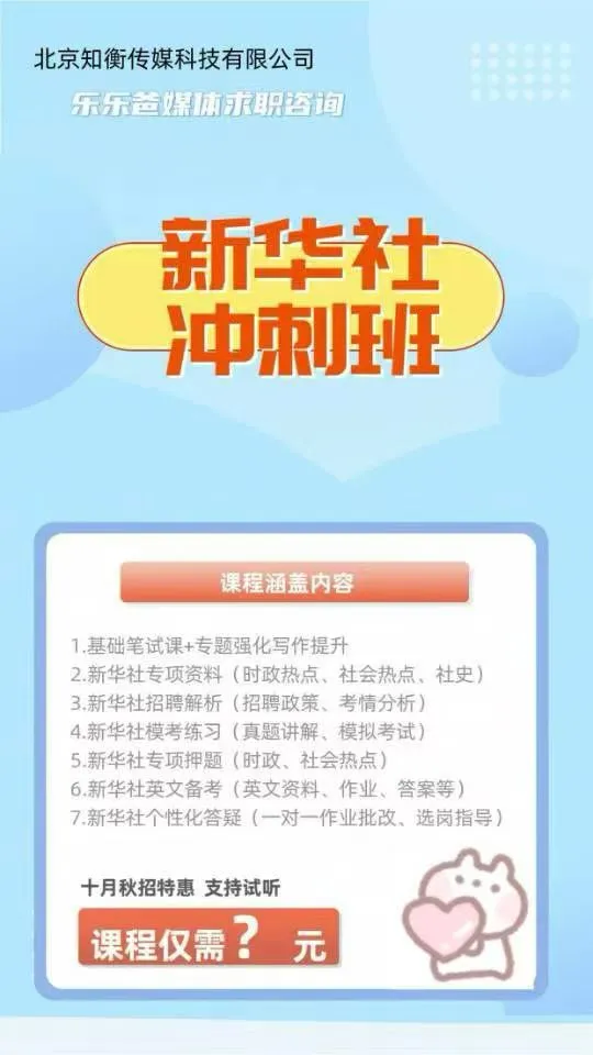 👊距离校招启动还剩不到一周,请同学们务必开始准备了,乐乐爸求职团队的新华社相应课程已经准备就绪,有问题欢迎咨询!