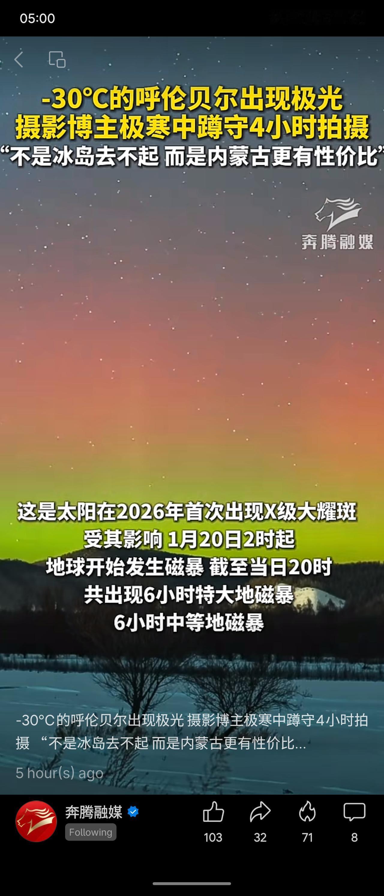 冬日生活打卡季1月20日,受太阳耀斑引发的地磁暴影响,内蒙古呼伦贝尔鄂伦春自治旗阿里河镇在-30℃极寒中出现了绚丽极光。有摄影博主冒着严寒蹲守四小时成功拍摄,并幽默调侃道“不是冰岛去不起,而是内蒙古更有性价比”。