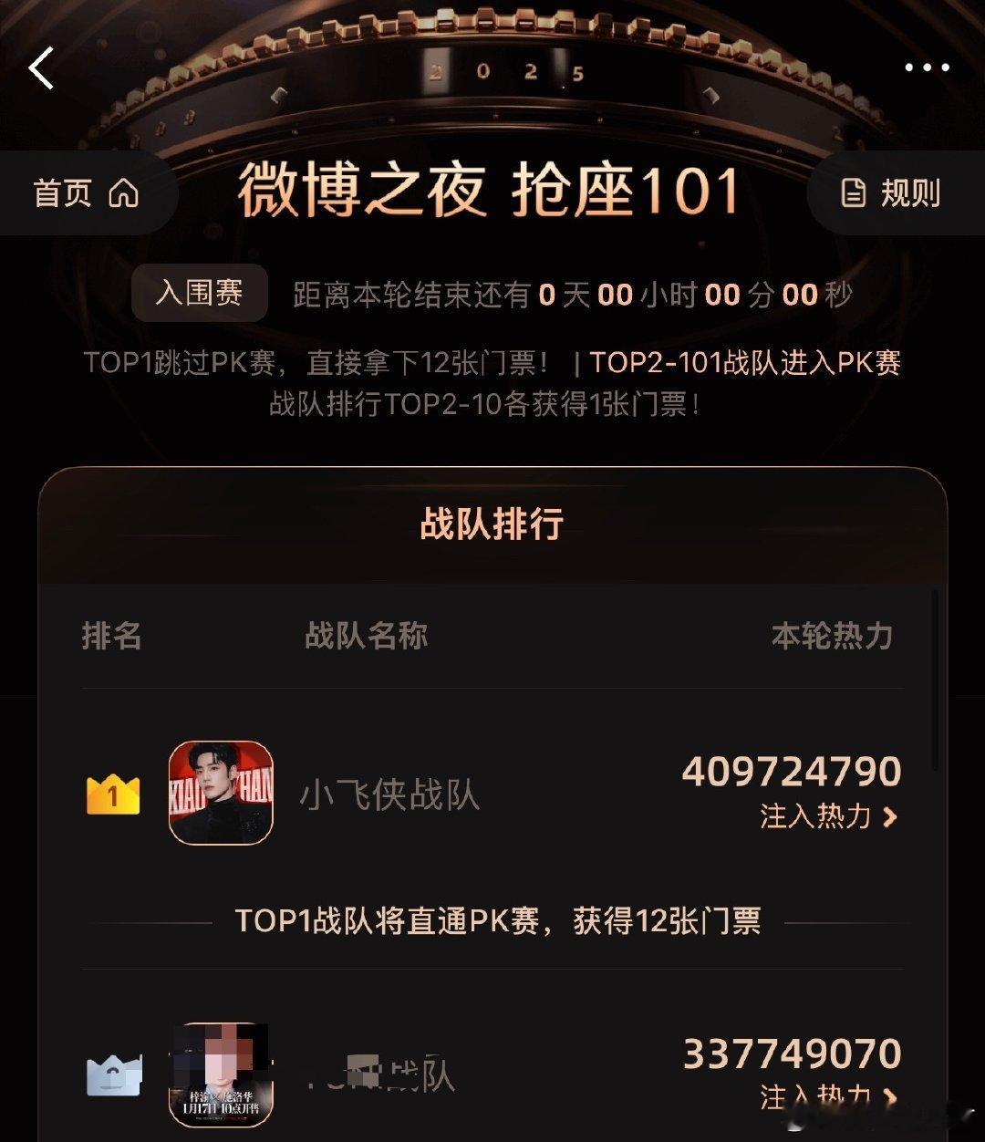 恭喜小飞侠战队,以7200万的绝对优势,大断层领先,以4.09亿热力值,拿下微博之夜门票抢座101当之无愧的第一☝️