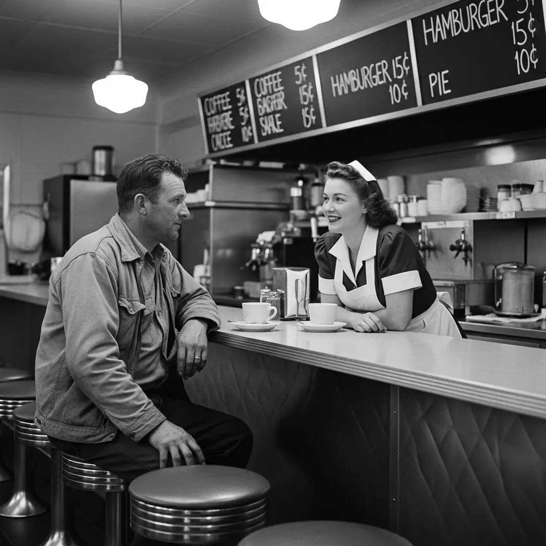 【老照片背后的故事】 克林顿,印第安纳州——餐车闲聊,1940年 1940年秋天。在印第安纳州克林顿镇的一家路边餐馆里,一位卡车司机捧着一个有缺口的咖啡杯暖手。他头顶的菜单上写着:热狗五分钱一份,红椒奶酪酱一角钱。女招待笑容爽利、伶牙俐齿,她能叫出每一位熟客的名字。餐馆外,他的卡车在飘落的树叶下渐渐冷却。餐馆内,故事在延续——关于长途跋涉、断掉的车轴,以及点唱机里的儿时的梦想。这家小餐馆不仅仅是一个大车司机歇脚点——它是一个信息咨询室,一个司机俱乐部,一种汽车流动的美国风情,在这里,油腻与温情相遇。