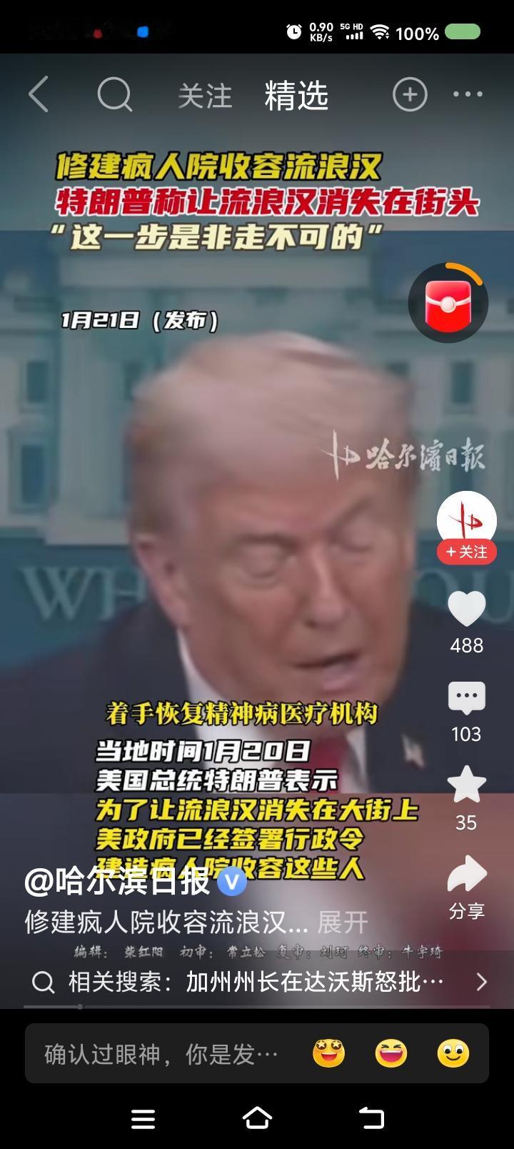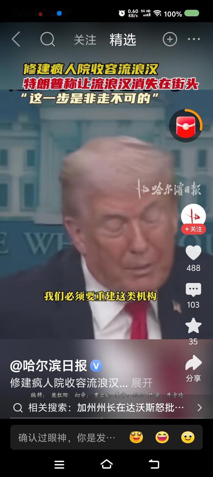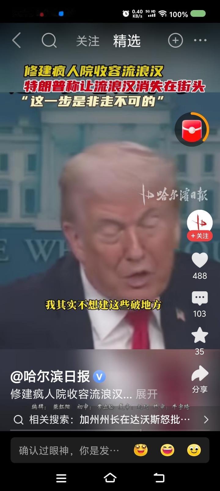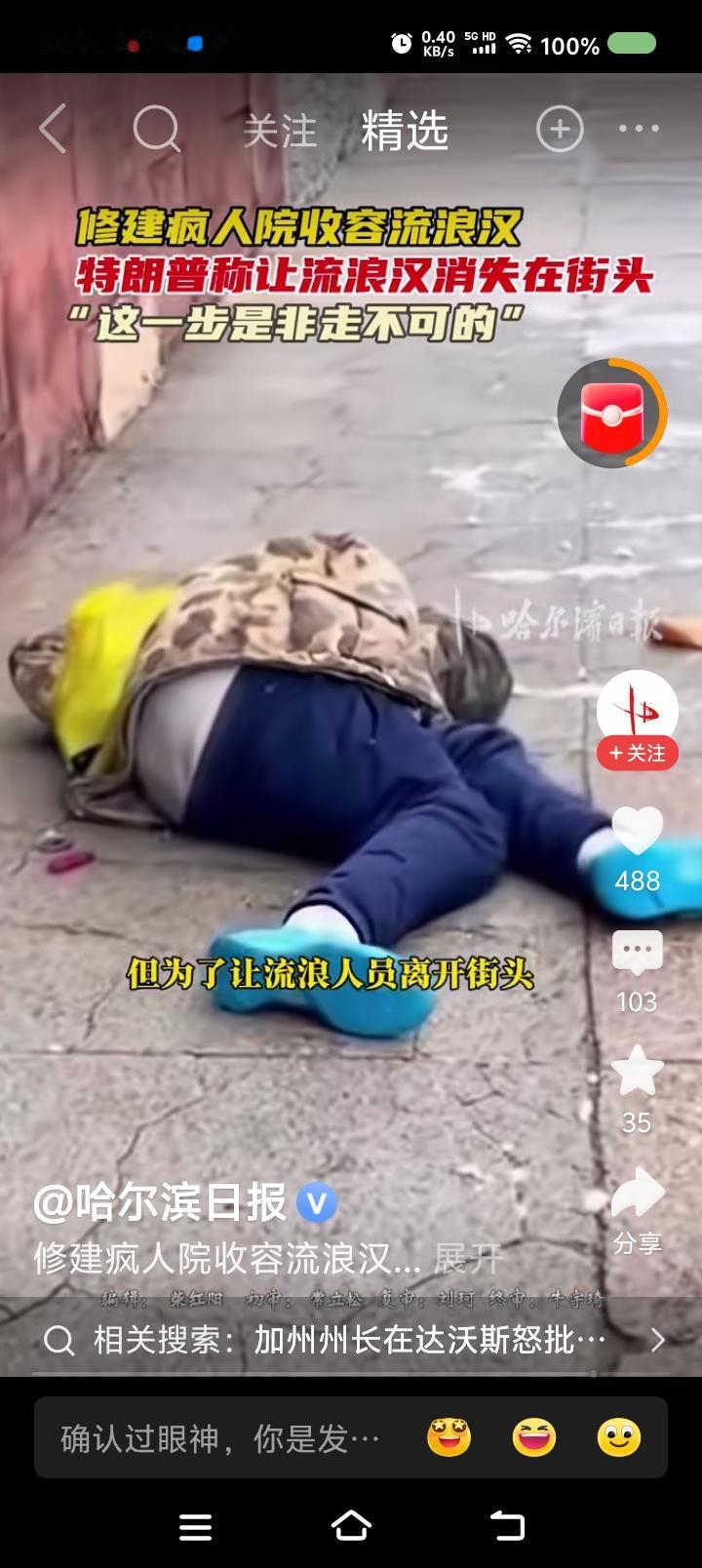特朗普,你的语气出卖了你!—— 据报道,特朗普说:“政府已经签署行政令,建造疯人院。为了让无家可归者消失。其实我不想建这些破地方,但为了让那些人离开街头……” 点评: 美国人民想问问:“这是总统说的话?” 冷血、麻木到如此地步!阶级本性暴露无遗!已经毫不掩饰了! 另外,这么一来,无家可归者成疯子了?