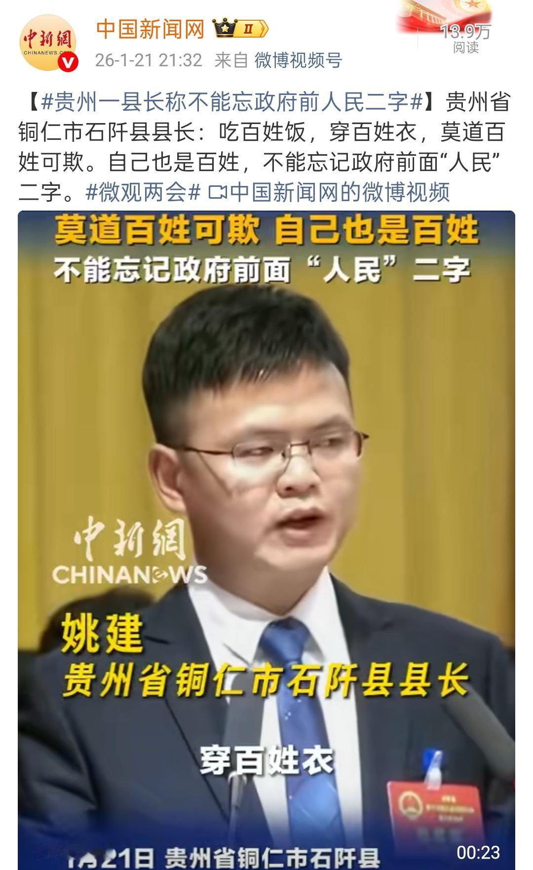 青年这番话,说到老百姓心坎里了 吃百姓饭、穿百姓衣,自己也是百姓。 姚建一句“莫道百姓可欺”,直接把官和民的关系说透了。 没有什么高大上的口号,就是大白话:ZF前面有“人民”两个字,做官的不能忘了根。 这话听着实在,老百姓就认这个理儿,心里装着百姓,百姓自然就会拥护。这样的接地气,才是最实在的为民情怀👍