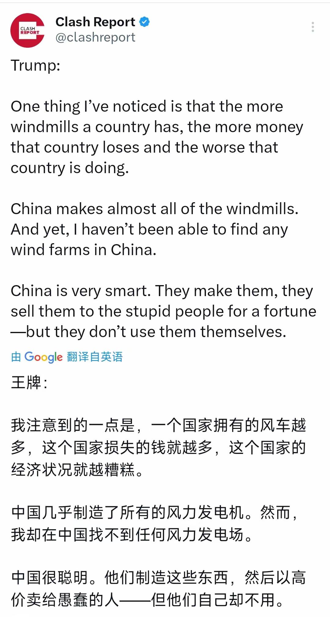 特朗普胡说八道的本事真是没改。 特朗普表示:“我注意到的一点是,一个国家拥有的风车越多,这个国家损失的钱就越多,这个国家的经济状况就越糟糕。中国几乎制造了所有的风力发电机。然而,我却在中国找不到任何风力发电场。中国很聪明。他们制造这些东西,然后以高价卖给愚蠢的人但他们自己却不用。” 有网友评论:当一个人可以在大庭广众之下说着可以被即时拆穿的谎言时,说明他的观众已经被完全信息管控住了,国外就是这种情况,少数知情者的澄清并不能改变绝大多数人被信息屏蔽后的愚蠢。仔细想想像不像清朝时期的人看外国人。发展好我们自己,让他们继续糊涂,历史清算指日可待。 这货很清楚,他是为了推销石油,抵毁新能源。 对此,你怎么看?